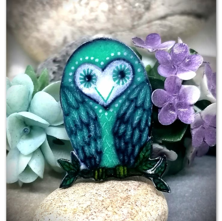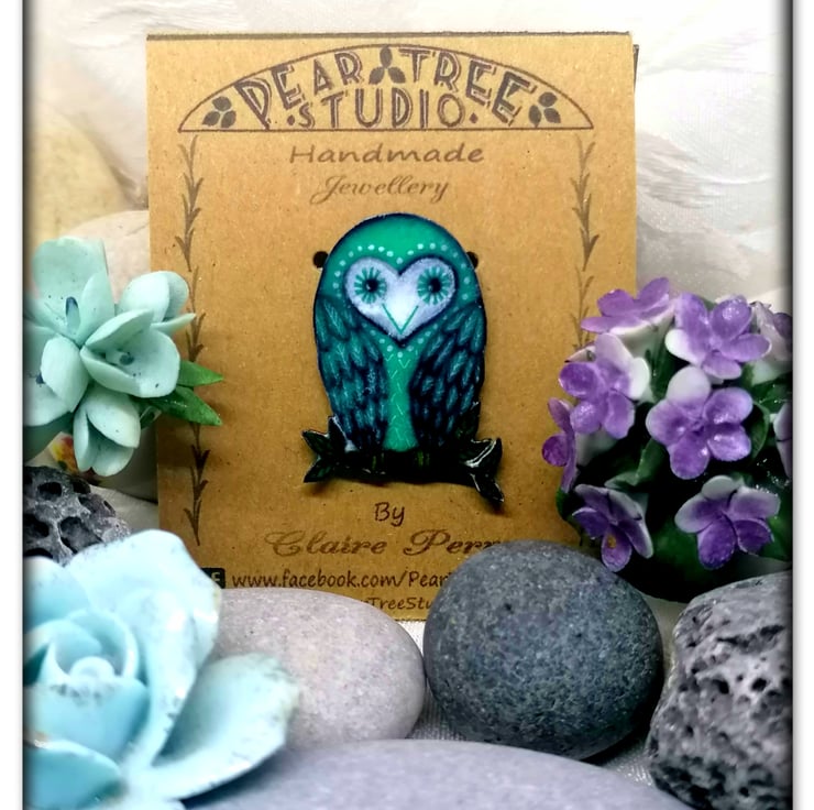 Owl Brooch, Handmade, Green