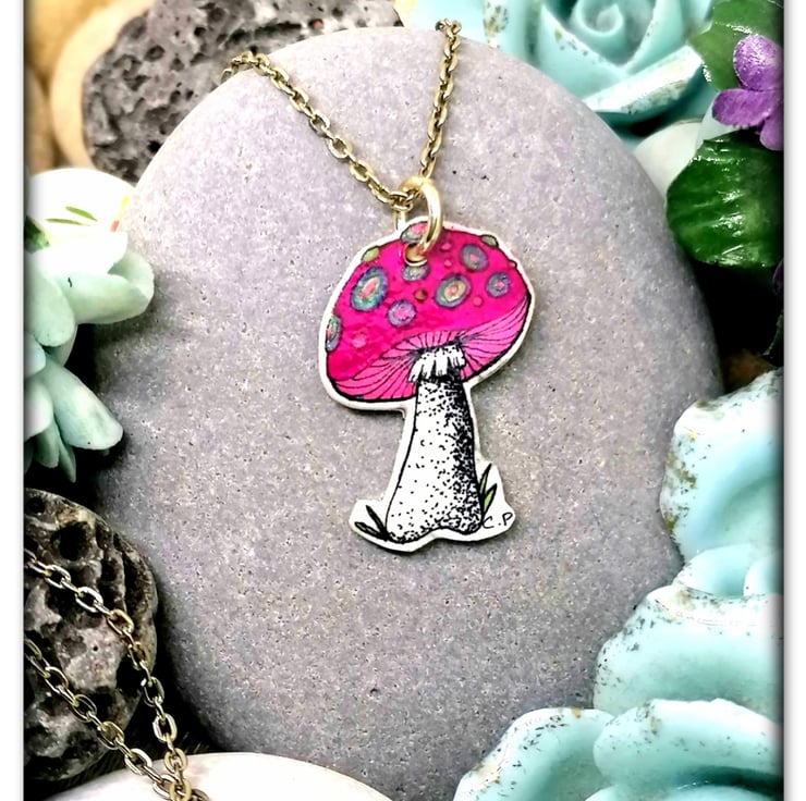 Toadstool pendant on a 22" inch silver plated chain, Handmade, pink
