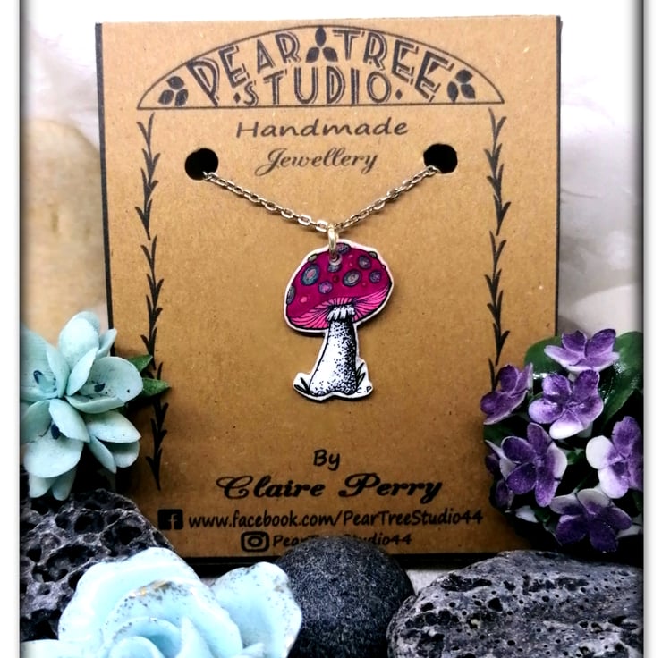 “Add a touch of whimsy to your jewellery collection with this handmade Pink toadstool pendant. Crafted with care, this unique piece features a vibrant toadstool charm on a silver plated chain, perfect for those who love fairy tale-inspired accessories.