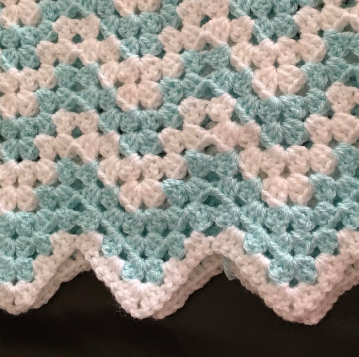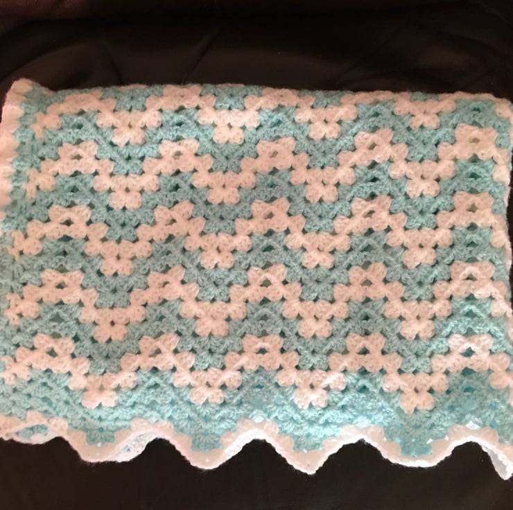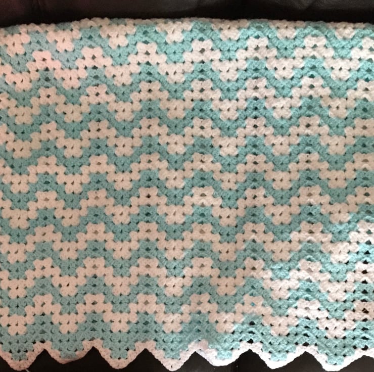 Crocheted in lovely soft dk yarn. This gorgeous blanket is made in zig zag pattern. White edging.