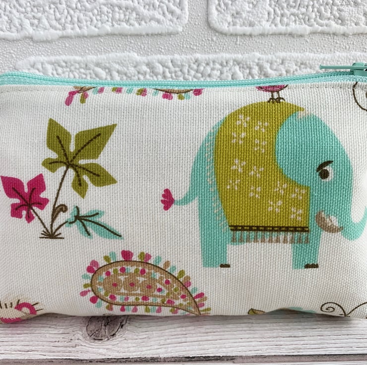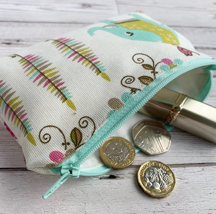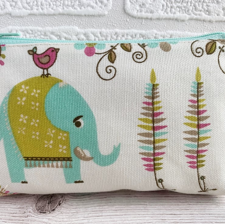 This large coin purse is large enough for bank cards and keys. It could also be used as a small make up bag or jewellery pouch. With its cute elephant and bird, it would make a lovely gift, particularly for anyone who loves animals.