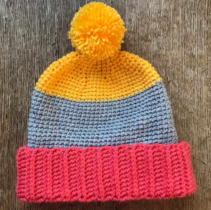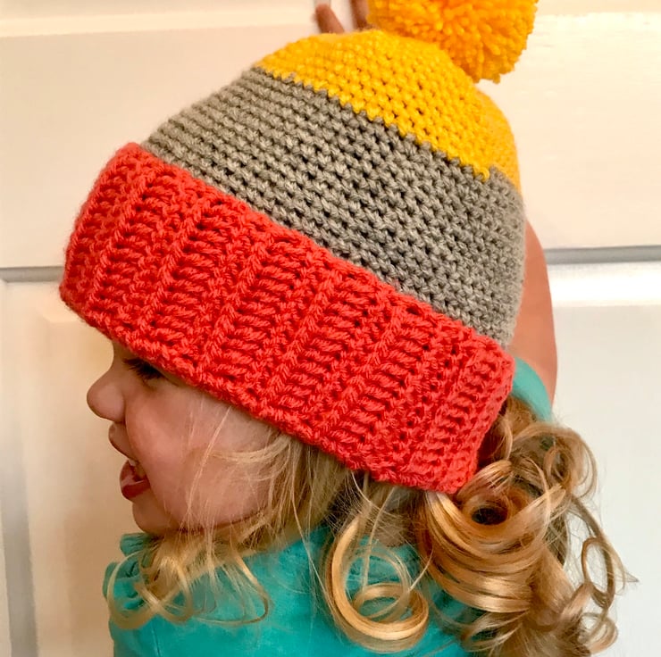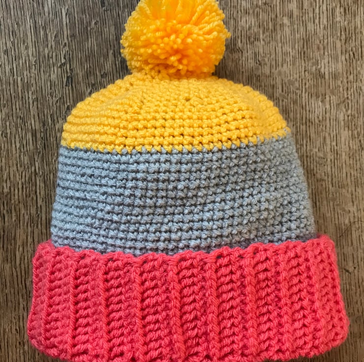 Something a bit different for your little one. A wonderfully bold and bright hat with a pom pom. It has a deep turned up brim to give extra protection to those little ears. The close stitch is perfect for keeping the wind out.