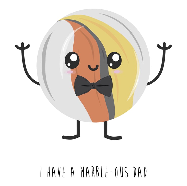 An A6 (folded) birthday card for Dad or Father's Day card made with 350gsm, matt FSC card depicting a hand drawn marble, wearing a bow tie and has a happy cartoon style face.