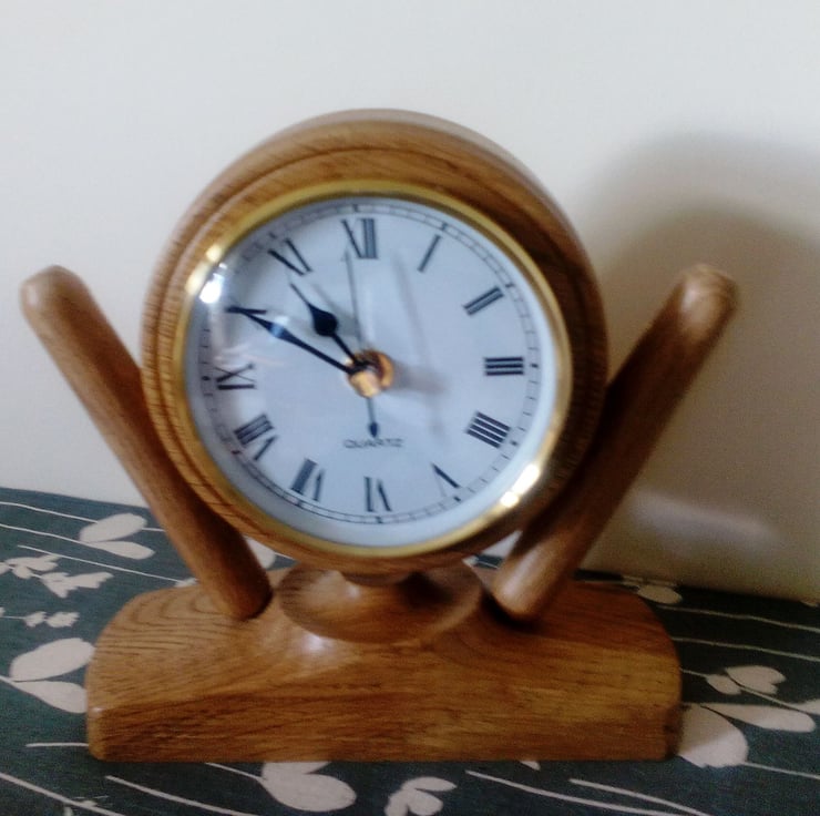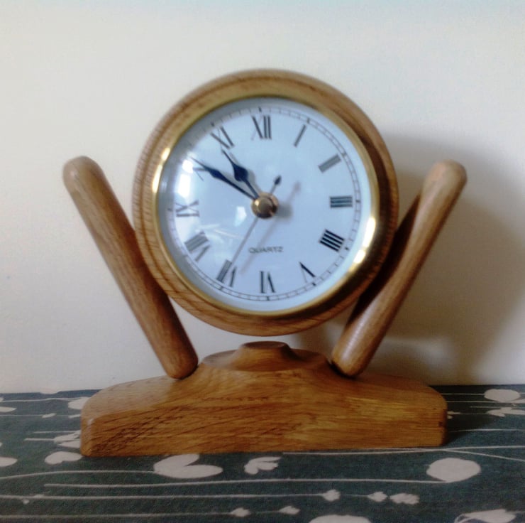10cm brass rim glass front quartz clock insert (AAA battery required) mounted in a stylish oak wooden surround. Clock insert is removable for adjusting time and battery change.