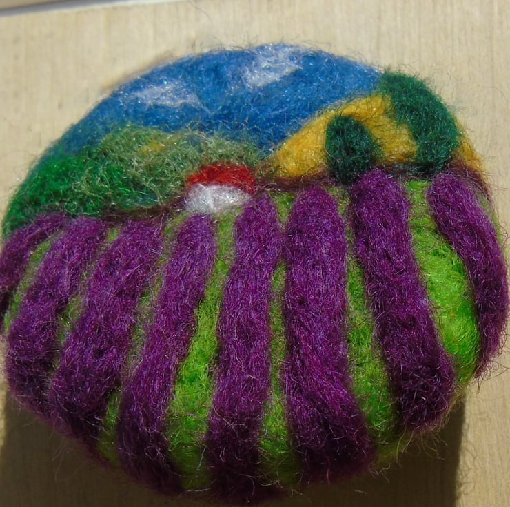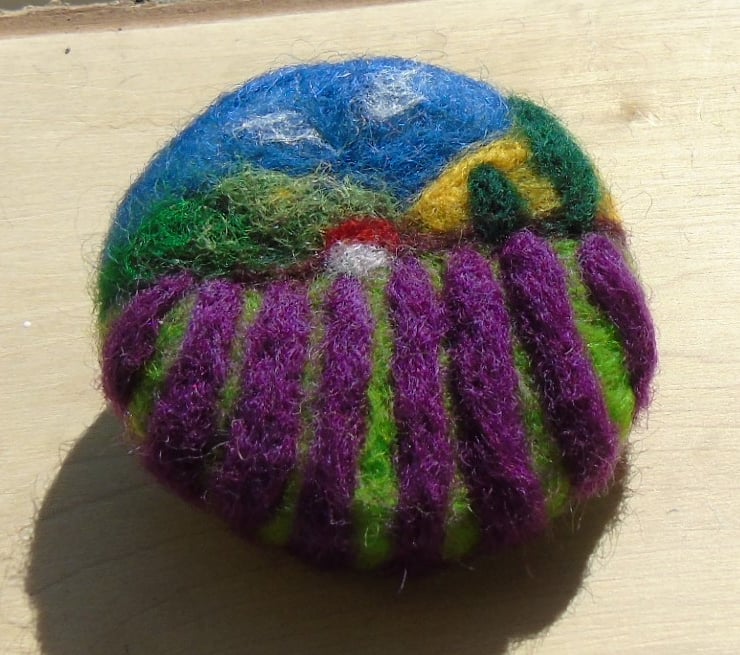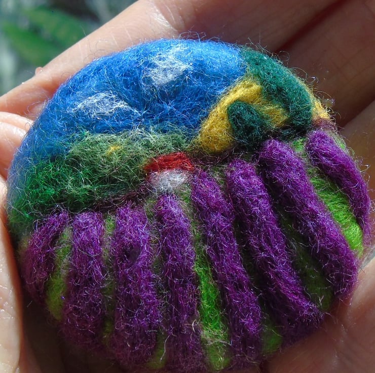 The core is wool worked into a firm shape by needle felting. The art work has been needle felted onto this firm shape.
