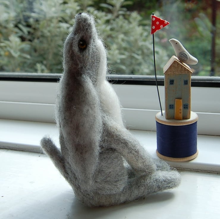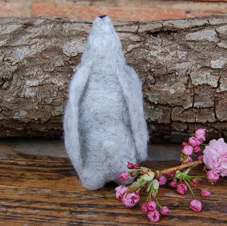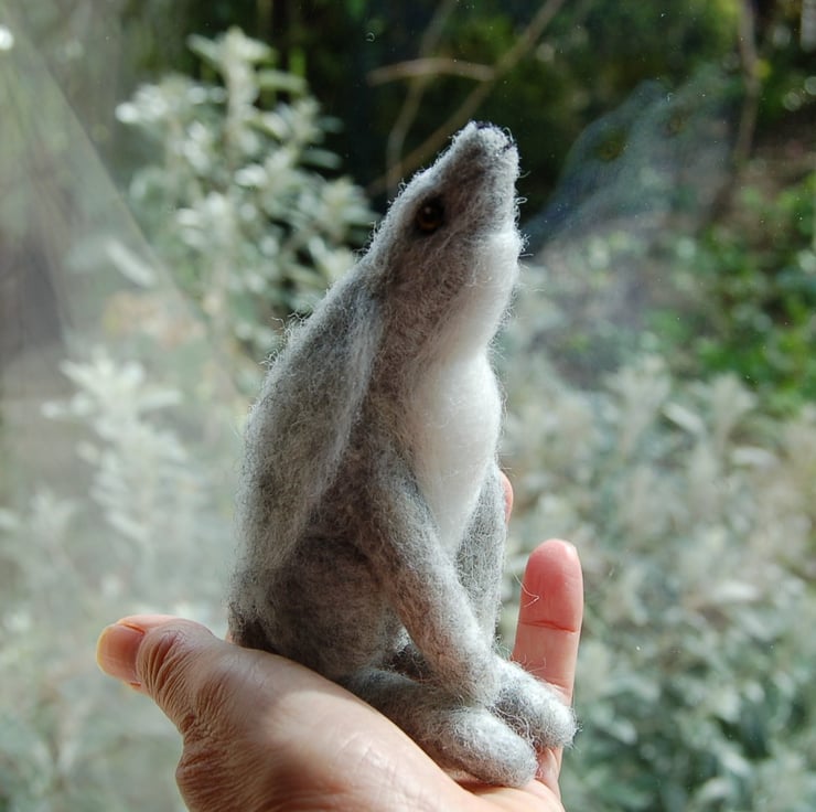 A beautiful needle felted grey hare gazing upwards towards the moon.