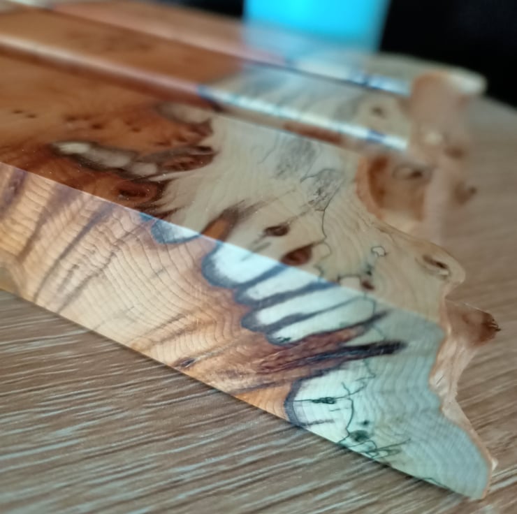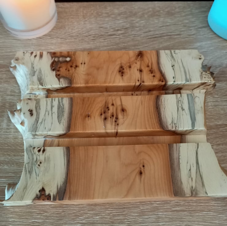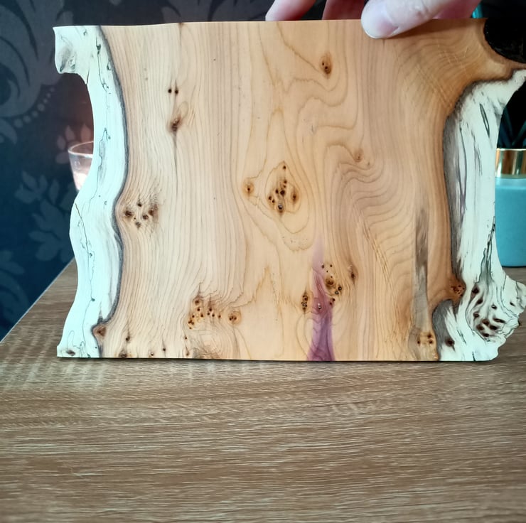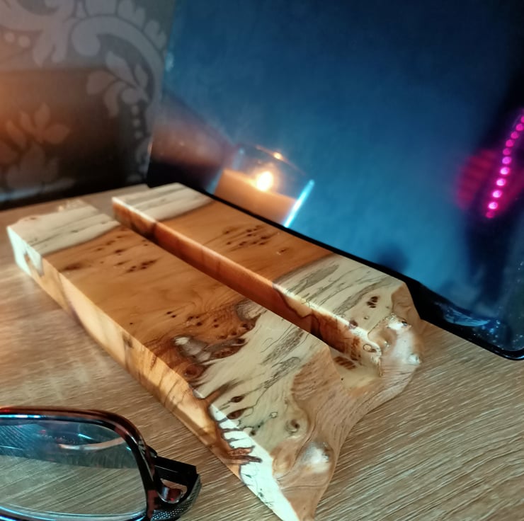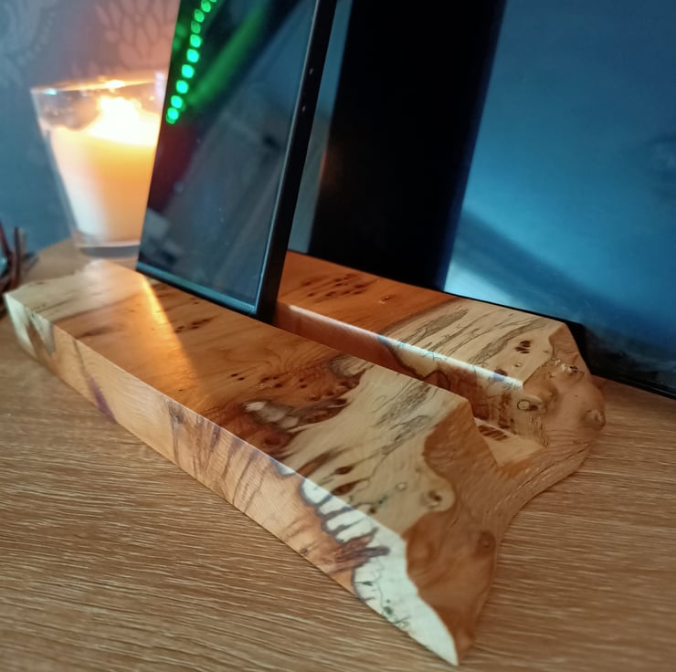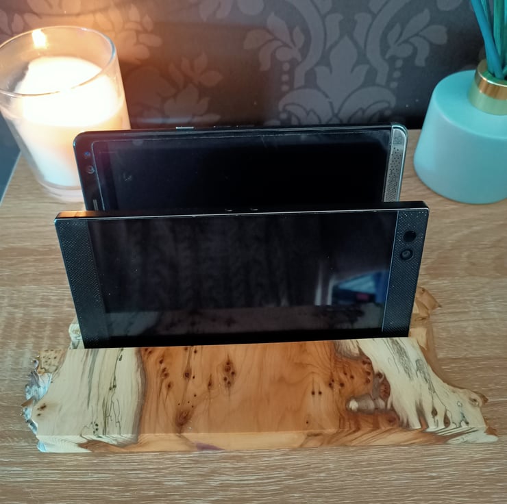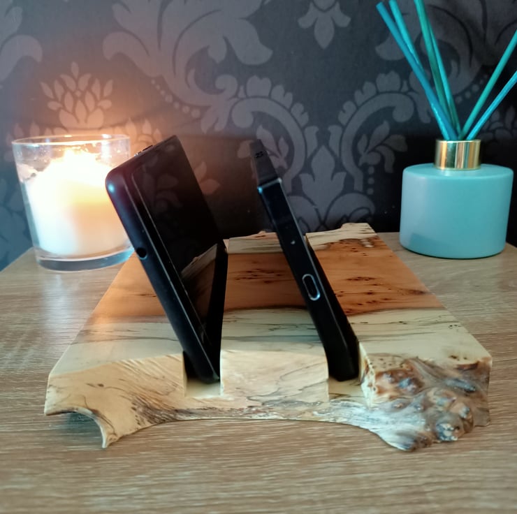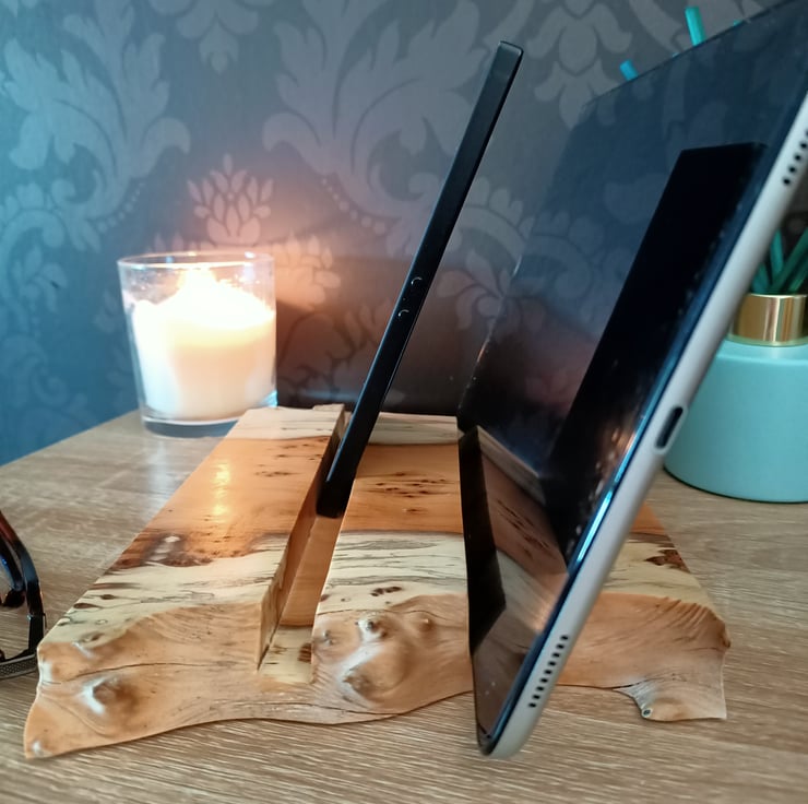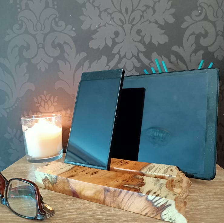 tablet stand. Phone charging station. Phone holder. Beautifully crafted from an ancient piece of Yew tree this multiple phone and tablet stand or holder is suitable for up to 4 mobile phones, 2 tablets, multiple variations. The yew wood has a superb grain with yellows, creams and black. The wood has natural pipping and lots of character. This luxury phone holder also has a beautiful natural purple grain running through it. The station has a waney live edge at the front and back, with straight clean lines on each side. The wood has two grooves hand carved for the phones to sit in. This is a unique phone holder handmade from a true craftsman. It is suitable for a family, a place for multiple technology. Its a really beautiful hand crafted piece, full of character and style.