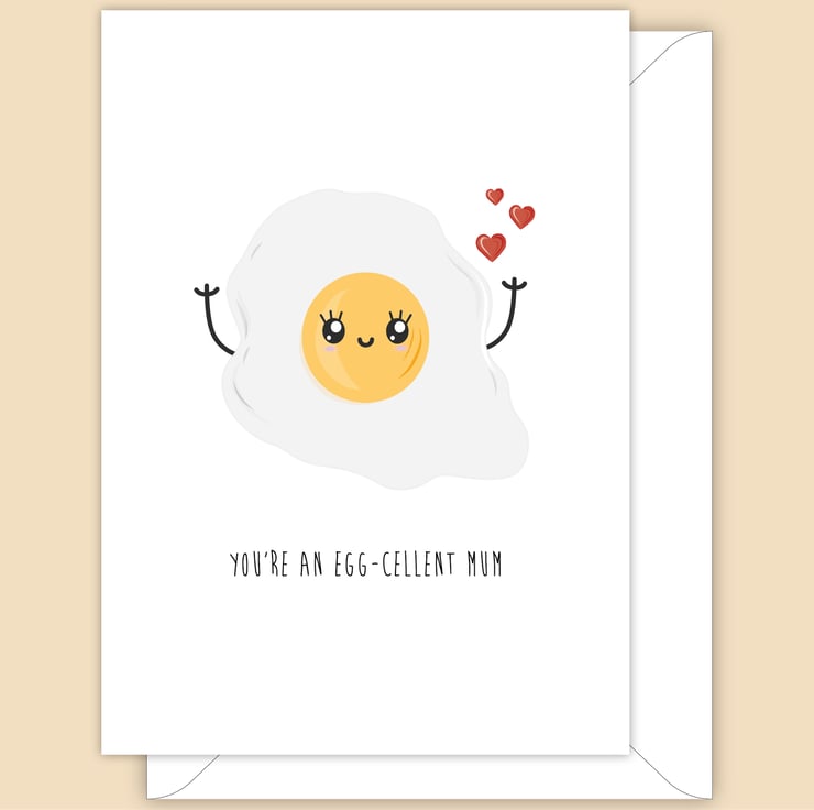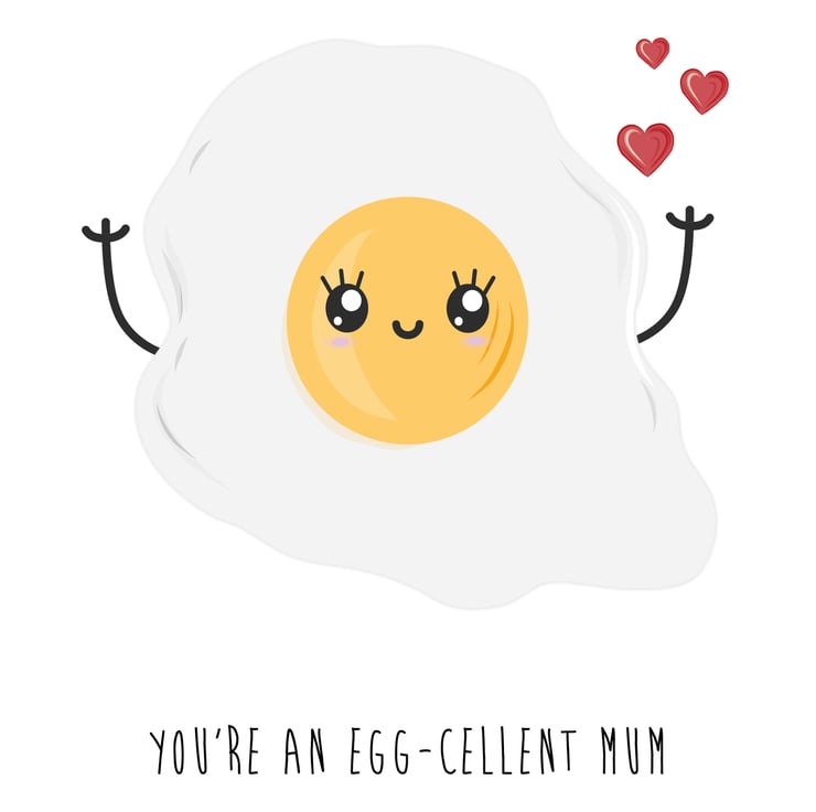 An A6 (folded) birthday card for Mum or Mother's Day card made with 350gsm, matt FSC card depicting a hand drawn fried egg, wearing a pink bow, streaming love hearts and has a happy cartoon style face with thick eyelashes.