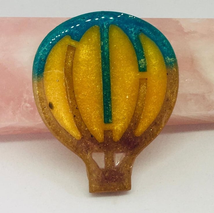 The hot air balloon is approximately 5 cm x 4 cm in size. The roll over clasp is glued to the back of the brooch.