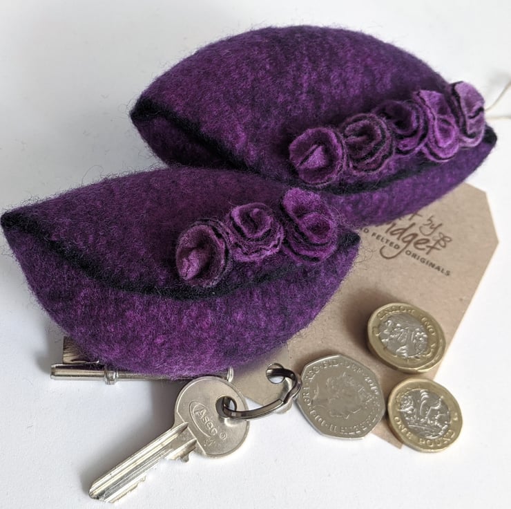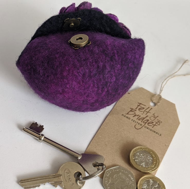 I make these from seamless spheres of handmade merino wool felt, shrunk and moulded into shape, then I add toning flowers and the magnetic closures. The underlying black layer of wool gives a lovely depth to the top colour.