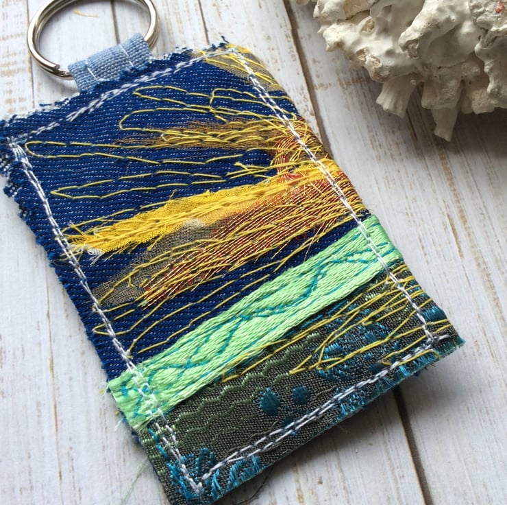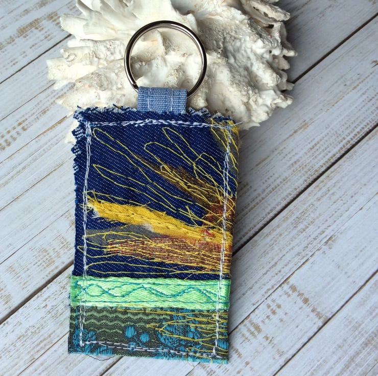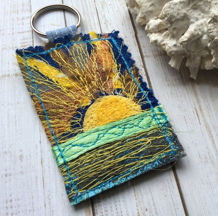 My handmade embroidered sun key ring is made from 100% up-cycled fabric and is embellished with free motion embroidery. The design is double sided. It measures 8cm x 5cm approx. With the split ring the length is 10cm.