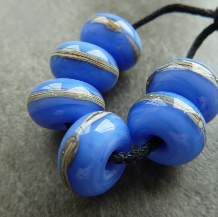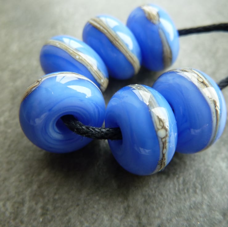 A set of 6 lampwork glass beads made with blue glass and wrapped with silvered ivory.