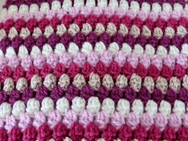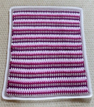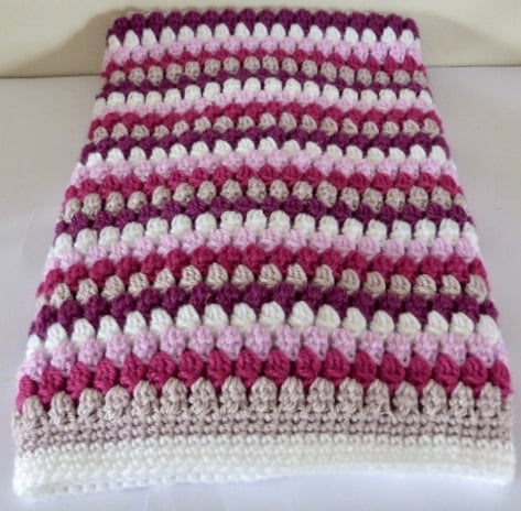 A crocheted blanket in 100% acrylic yarns in five colours - White, Mushroom, Candy Pink, Magenta and Deep Pink. It measures approximately 70cm x 56cm and has a wide border. Ideal for tucking baby up in a pram or pushchair, moses basket or car seat. It would make an ideal Baby Shower or new baby gift.