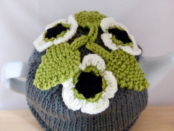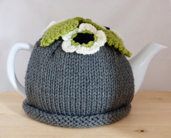 Knitted in a chunky charcoal grey 100% acrylic yarn to fit a standard 4 - 6 cup pot. This cosy should fit a variety of pots as it has plenty of stretch and a roll rim. Trimmed with three crocheted flowers and three knitted leaves this colour way and design would suit most settings. Just pull the cosy over your pot (as it has slits for the handle and spout) to keep your tea warm.