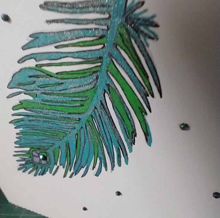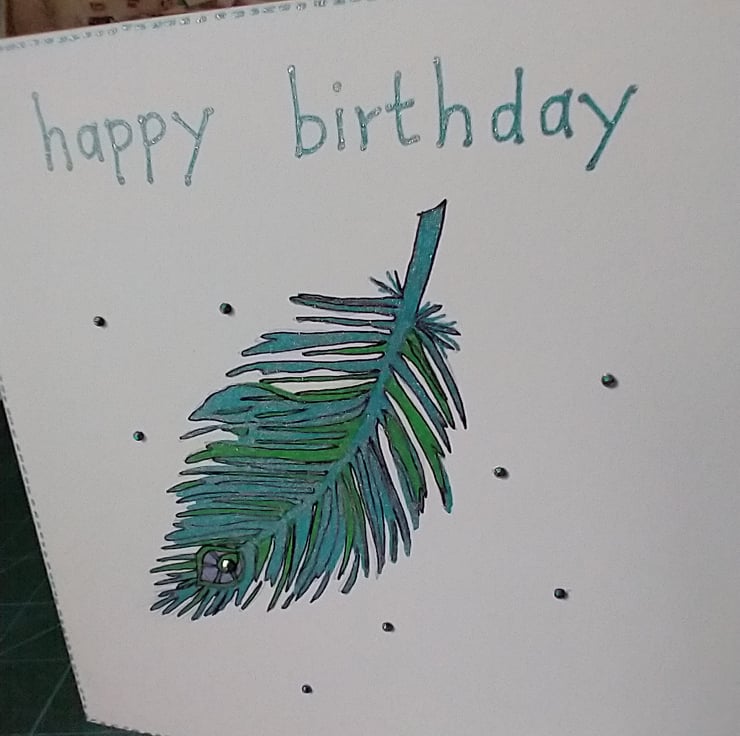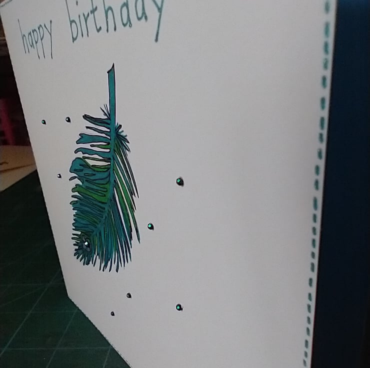 A completely handmade and uniquely designed card. Consisting of a feather hand drawn in black ink. Coloured with blue, green and purple inks. Embellished with co ordinating rhinestones. Happy birthday hand written in turquoise ink