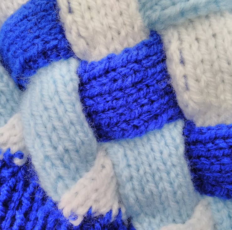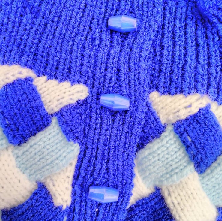 Child's cardigan, hand knitted in three colours with 100% acrylic baby yarn.