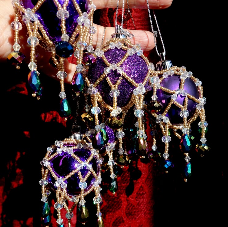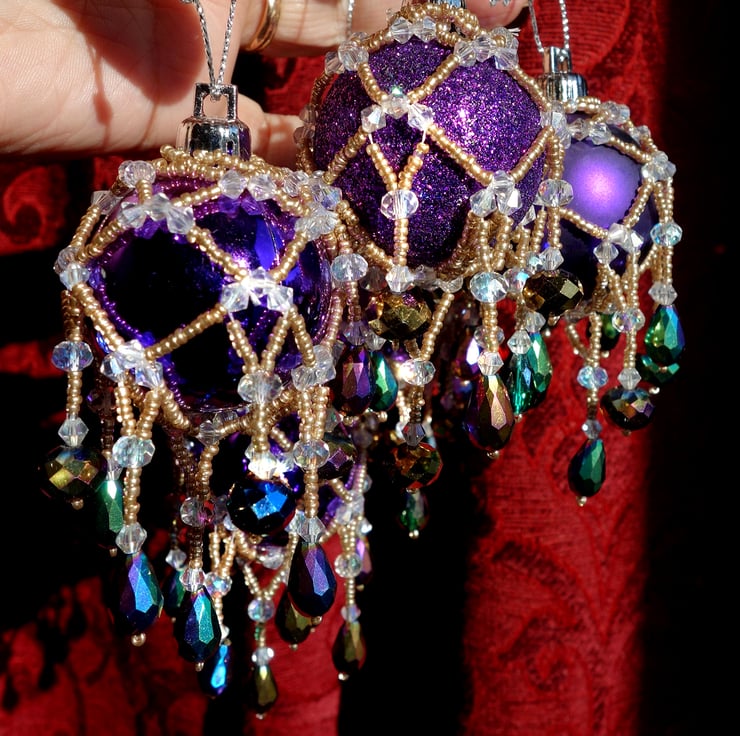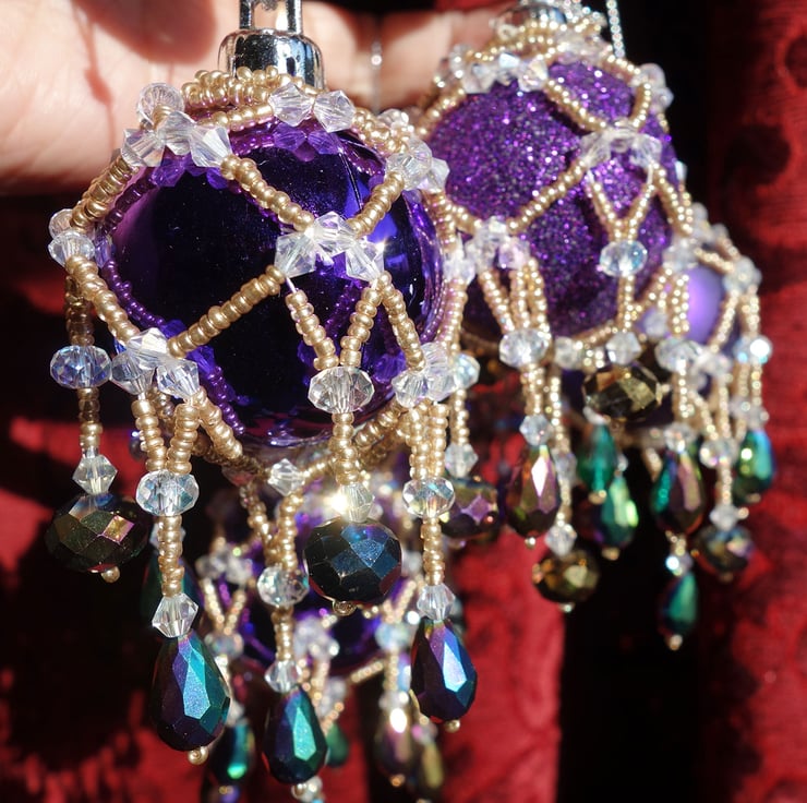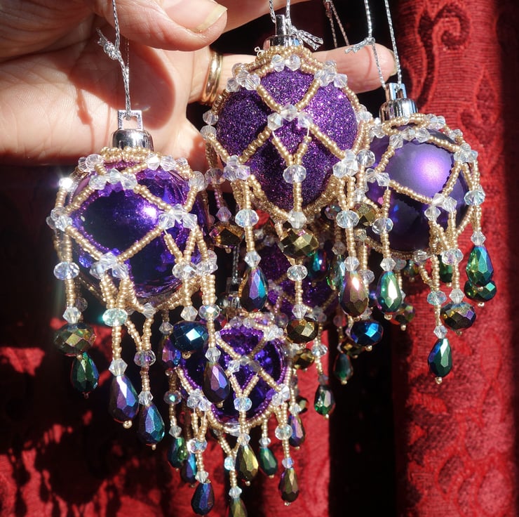 8 Royal Purple Christmas Tree Baubles decorated with crystal beads and toho seed pearls. Each one has iridescent petrol drops and beads to sparkle and scintillate under your tree lights.