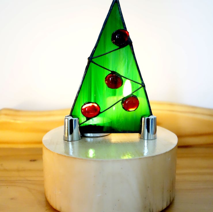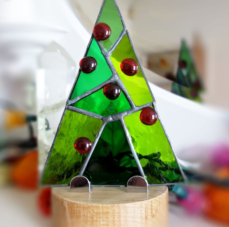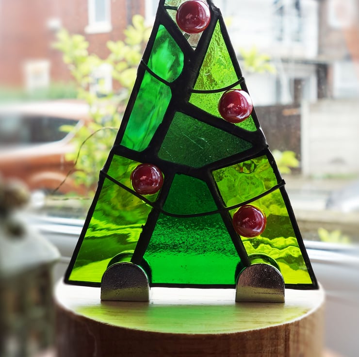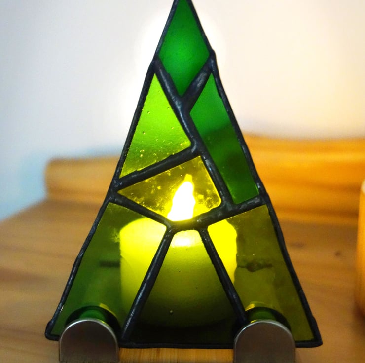 This stained glass Art Deco inspired Christmas Tree lamp is crafted from different shades and textures of green stained glass, leaded using the Tiffany style copper foil technique.