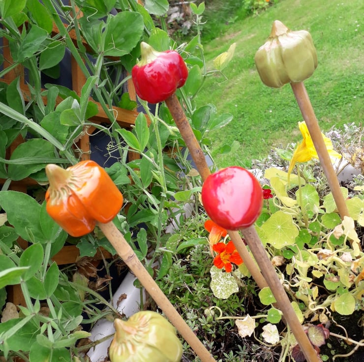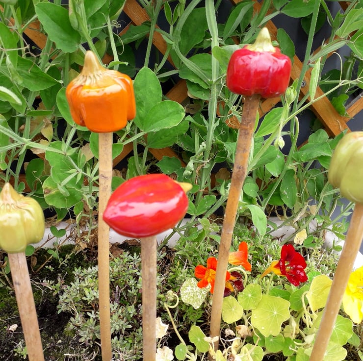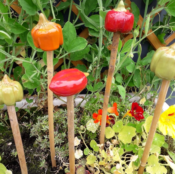 Cane Tops for your garden. Made from red earthenware clay, all glazed to suit the subject! Last for years and years in all weathers in your garden. The Pepper Collection. I use a variety of different bamboo canes to give a variety of hole sizes to fit bamboo canes.