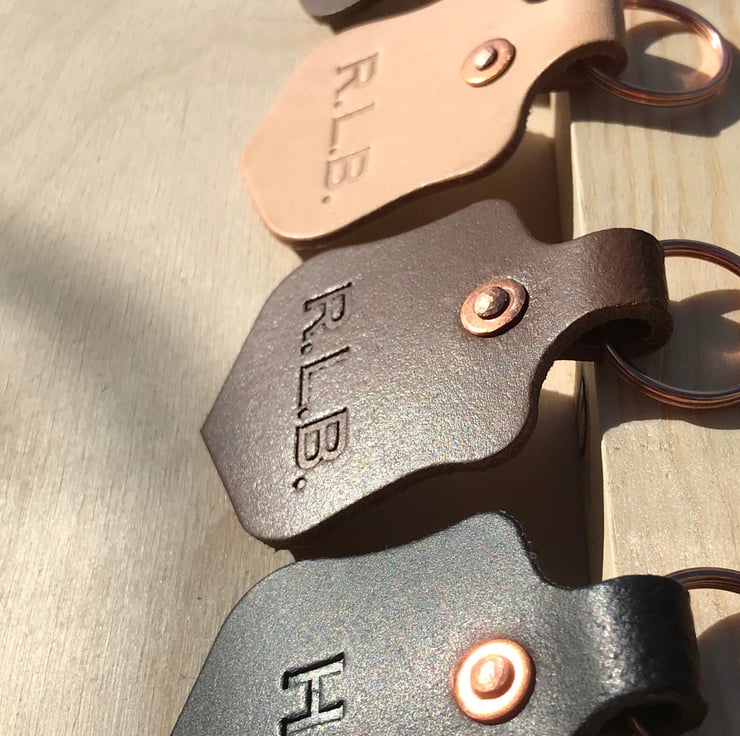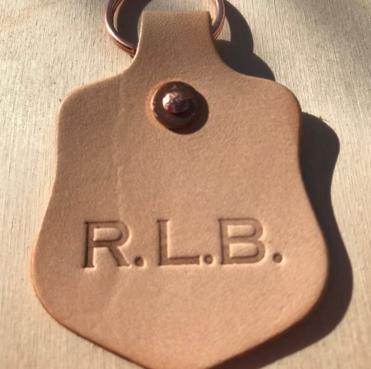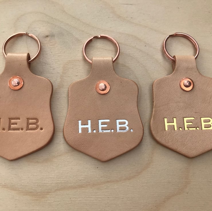 Natural Veg-Tan 2mm hide. Name or initials up to 4 characters in this classic block letter available in following colours: Gold, Silver, Blind de-bossed (no foil).