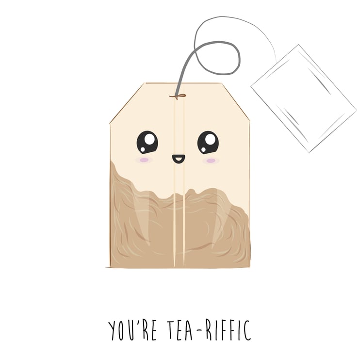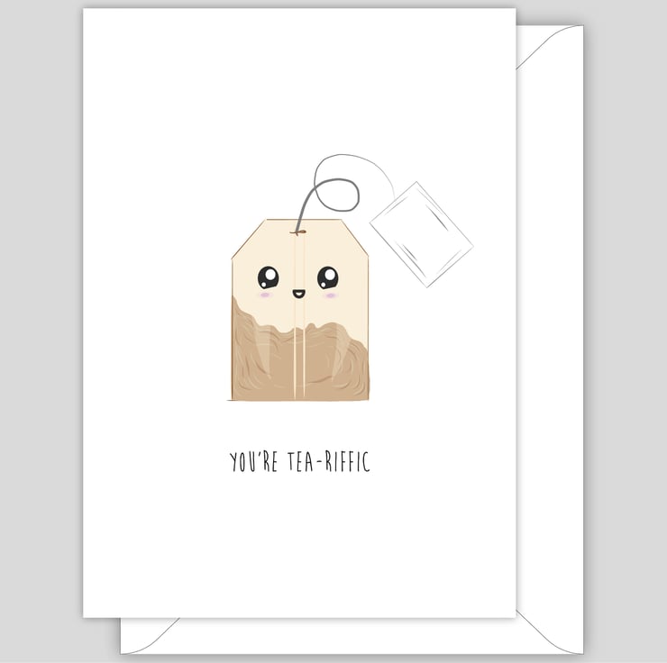 An A6 (folded) thank you card made with 350gsm FSC card depicting a hand drawn tea bag that has a happy cartoon style face. The card is silk coated on the outside to make the image pop and matt on the inside so you can easily write your own message.