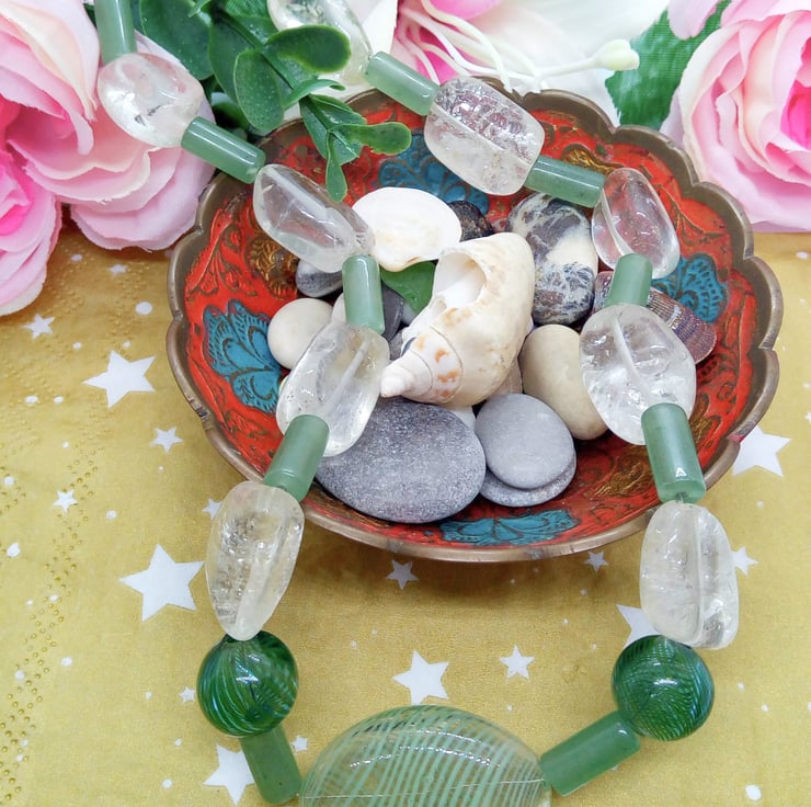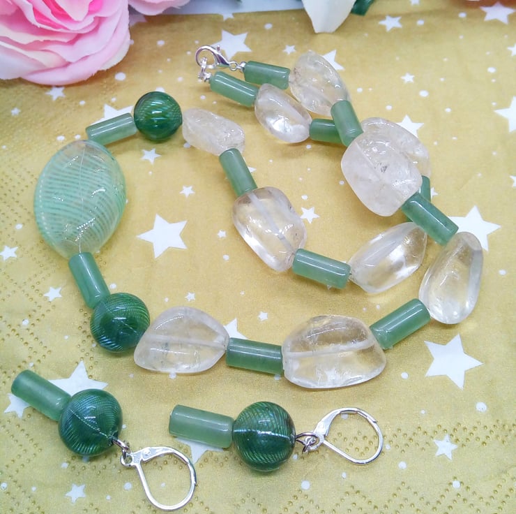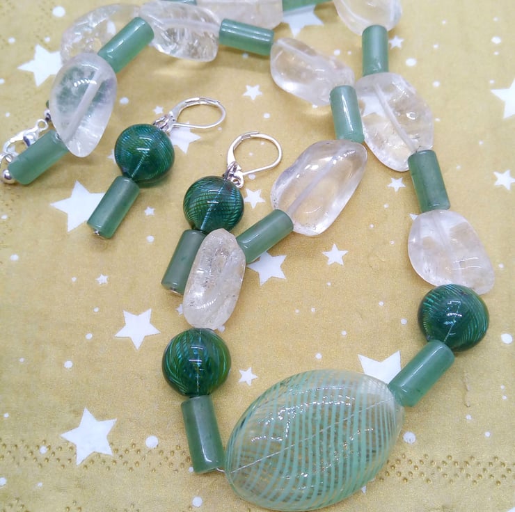 This lovely jewellery set is made using clear quartz nugget beads measuring approximately 20mm x 18mm, 12mm x 5mm green glass tube beads, 12mm hollow puffed round glass beads and a stunning hollow puffed oval green glass bead measuring 35mm x 22mm. The earrings have the round hollow green glass bead and a green tube bead with silver plated lever backs. The necklace has a silver plated lobster clasp.