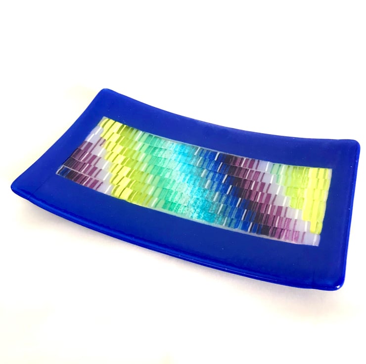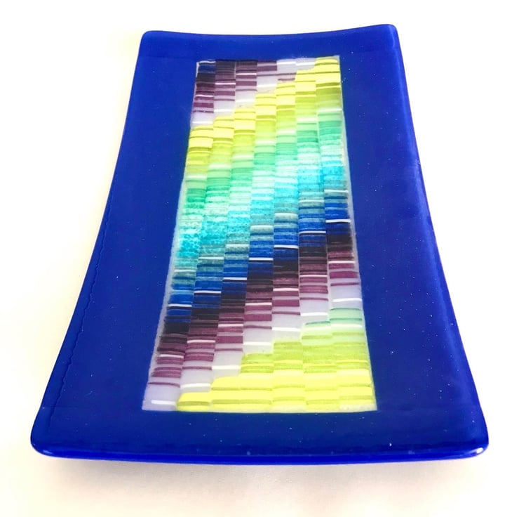 Add a bold, artistic statement to your home with this Fused Glass Tapestry Platter, a vibrant and meticulously handcrafted piece of glass art. Created through a multi-stage kiln process, this platter features a striking tapestry-style pattern made from individually fused strings of coloured glass.