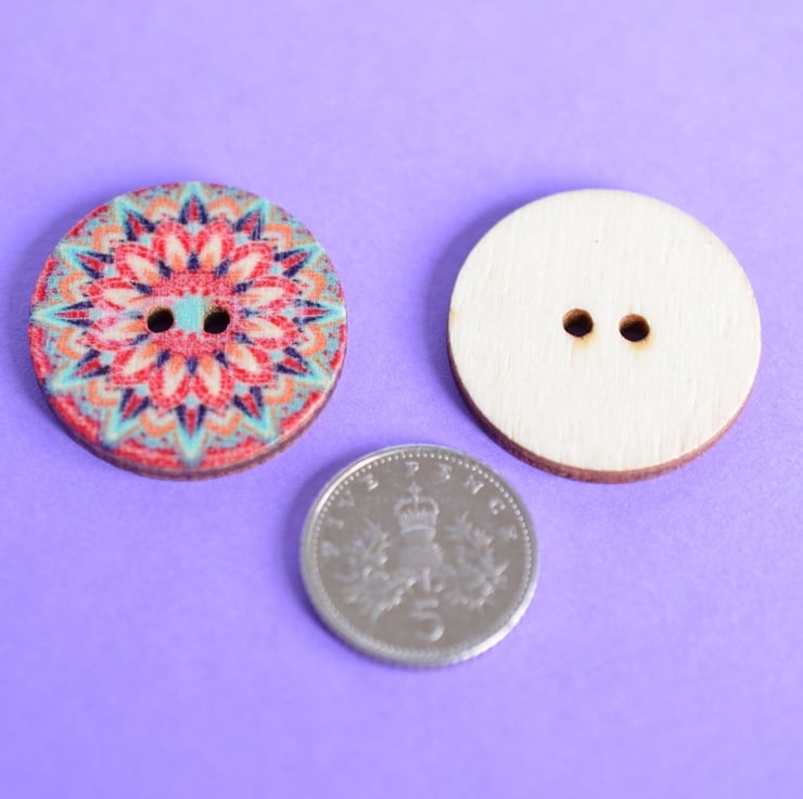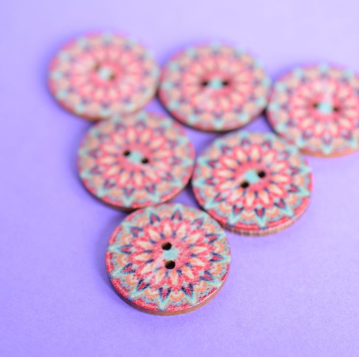 Wooden Mandala Patterned Buttons Salmon Pink Purple Aqua 6pk 25mm (M13)