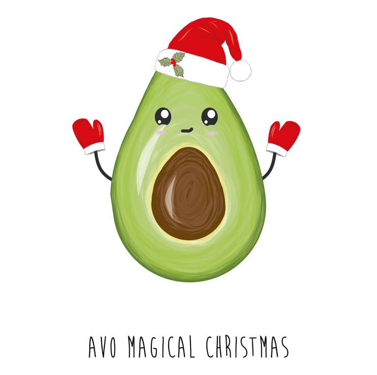An A6 (folded) Christmas card made with 350gsm FSC card depicting a hand drawn avocado, wearing a Christmas hat and mittens with an excited cartoon style face. The card is silk coated on the outside to make the image pop and matt on the inside so you can easily write your own message.