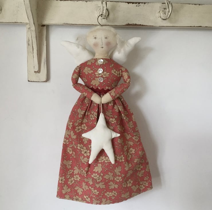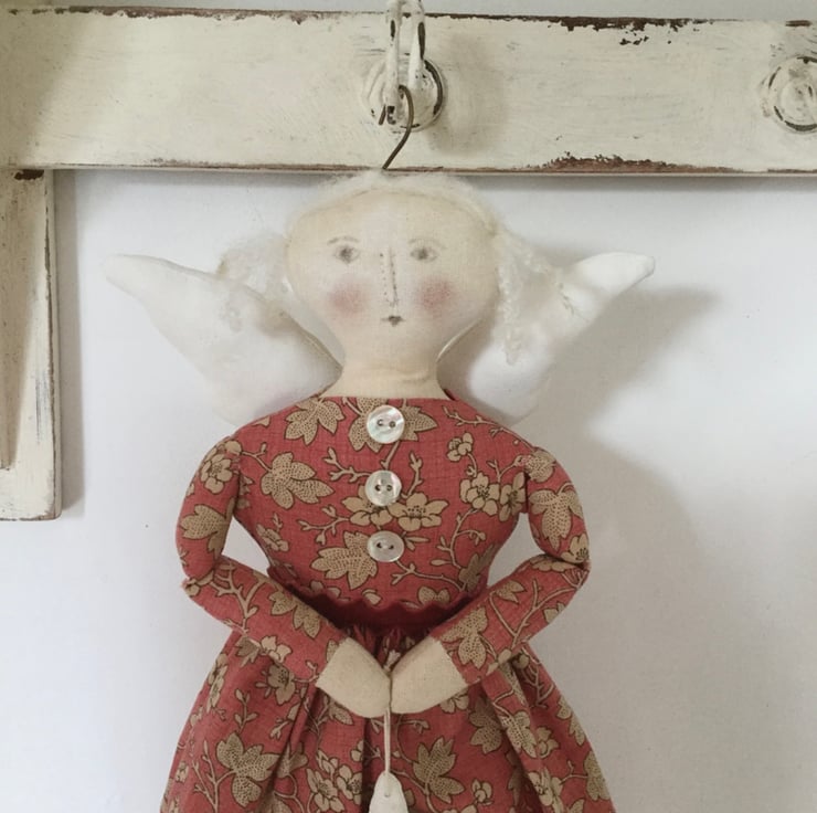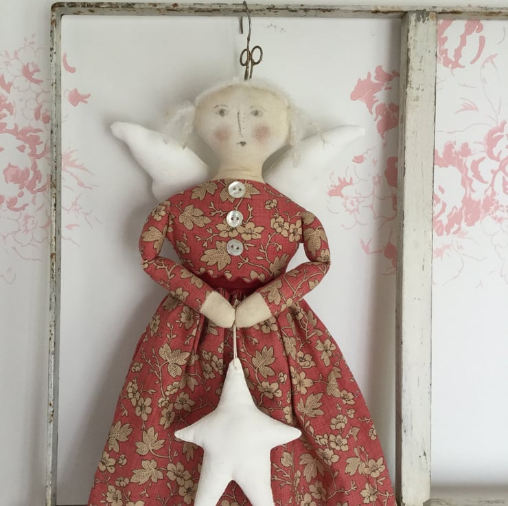 She is wearing a printed dress, trimmed with velvet ric-rac and three vintage pearl buttons. She is holding a fabric painted star. The hemline is finished with a row of embroidered running stitches. Her stuffed wings are made from painted fabric.