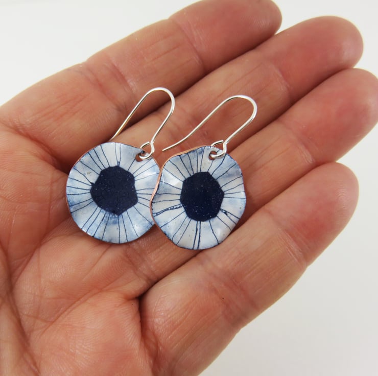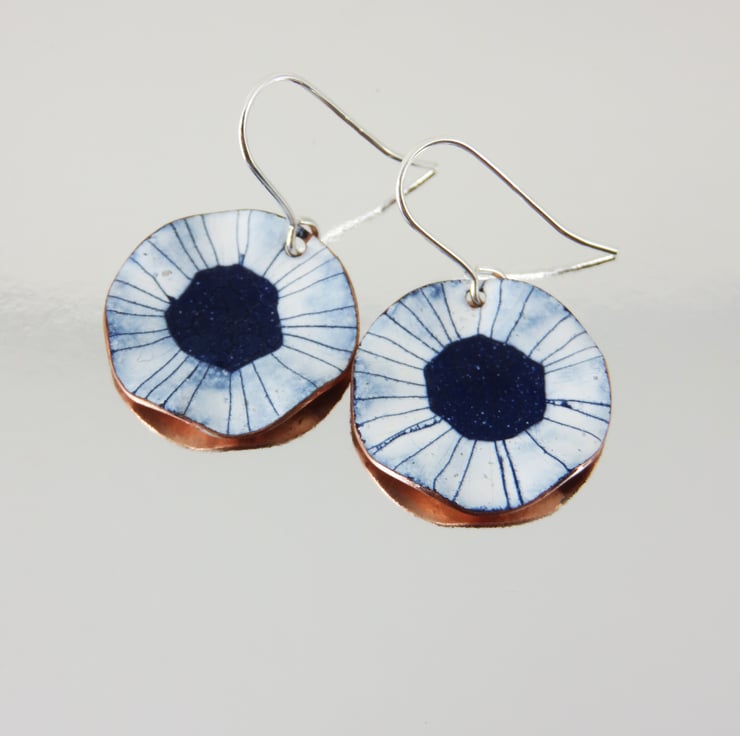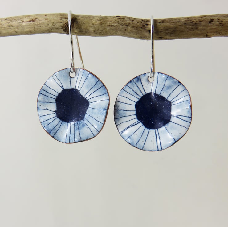 18mm wide copper discs have been fluted to create a wavy edge. Silver wires are attached at the top. Layers of dark blue and white enamel have been applied and fired several times. Lines have been drawn though the white enamel by hand. The back of the earrings are a shiny copper. Unique one offs due to the process. Delivered to you in a gift box with information about the enamelling process.