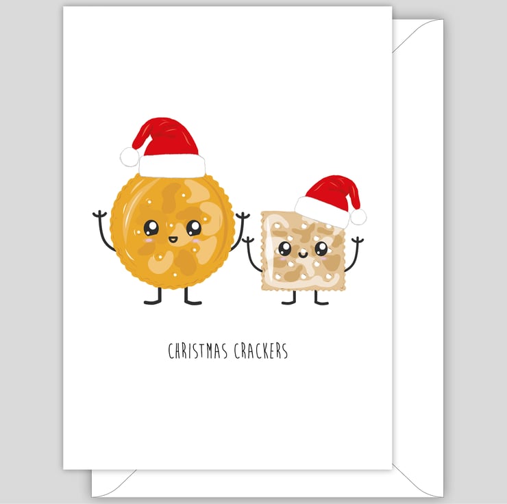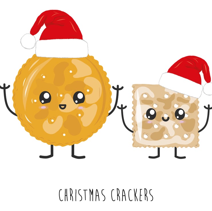 An A6 (folded) Christmas card made with 350gsm FSC card depicting a pair of hand drawn cheese crackers, wearing a Christmas hats and both have an excited cartoon style face. The card is silk coated on the outside to make the image pop and matt on the inside so you can easily write your own message.