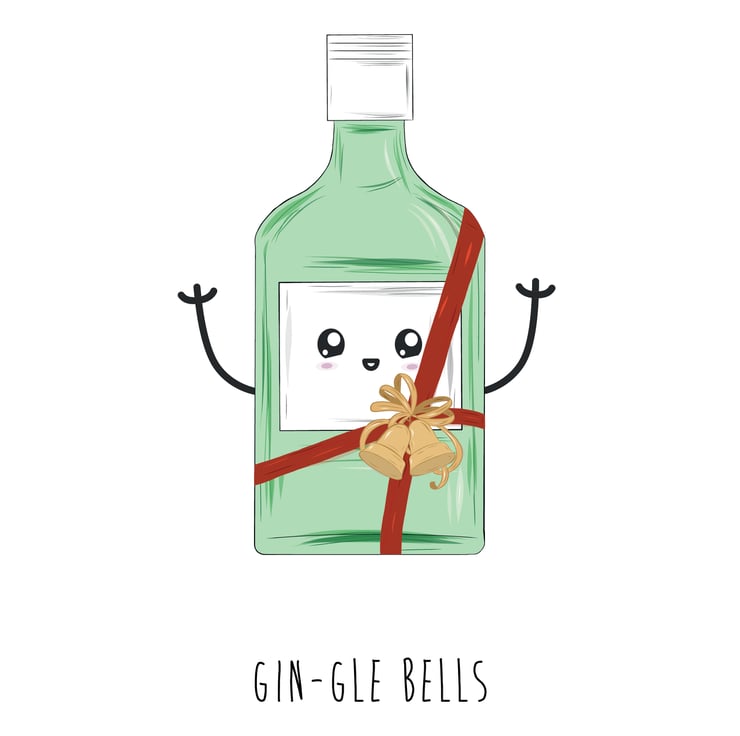 An A6 (folded) Christmas card made with 350gsm FSC card depicting a hand drawn bottle of gin wrapped up like a present with an excited cartoon style face. The card is silk coated on the outside to make the image pop and matt on the inside so you can easily write your own message.