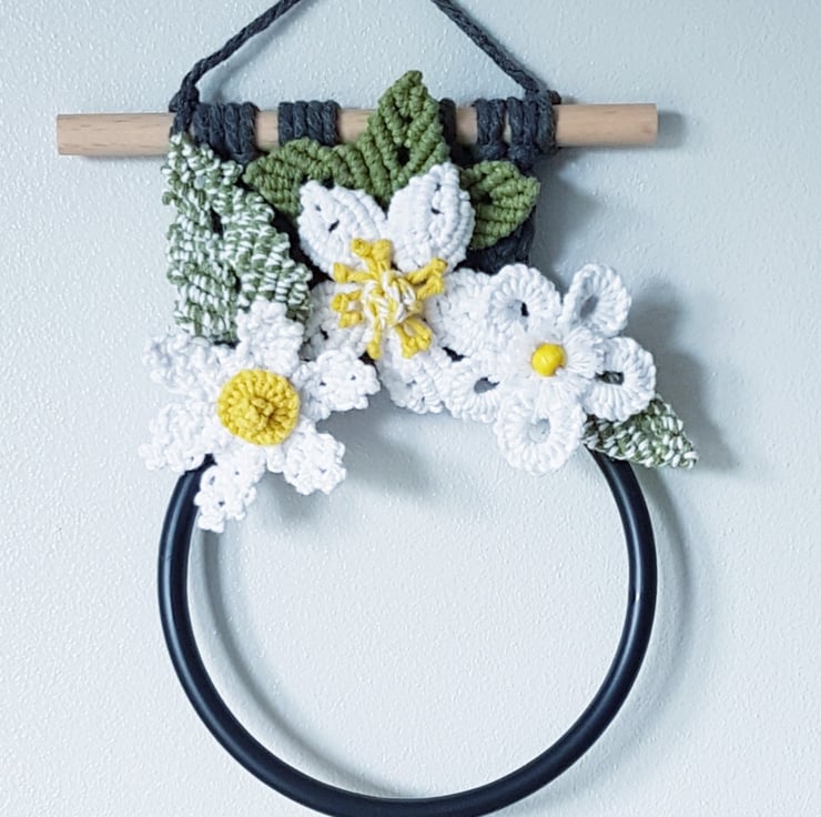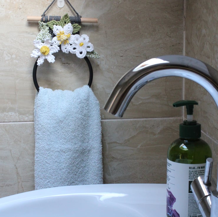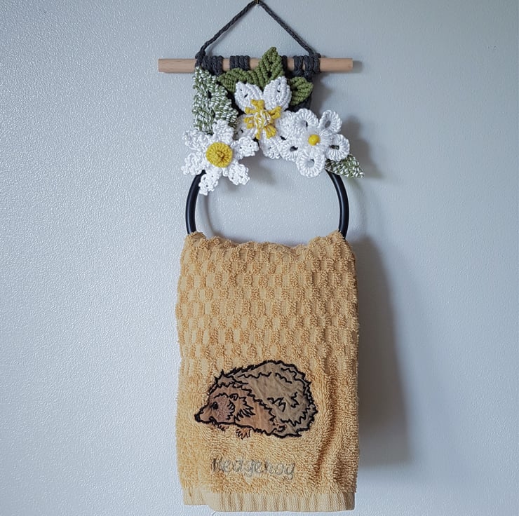A pretty hanging tea towel holder decorated with 3 white flowers. Each flower is different and has a yellow centre. There are 3 different style leaves, 2 are variegated and one is plain green The marl grey backing is attached to a 15cm wooden dowel and the circular hanging rail attached is graphite colour.