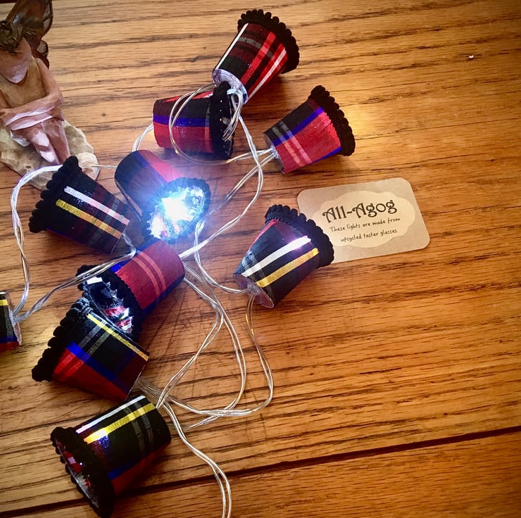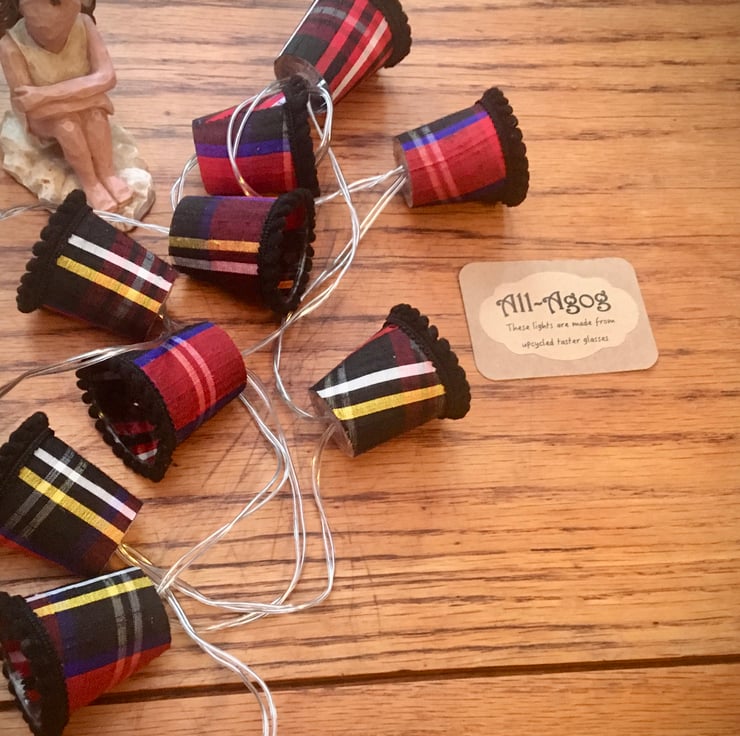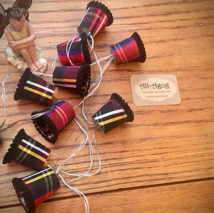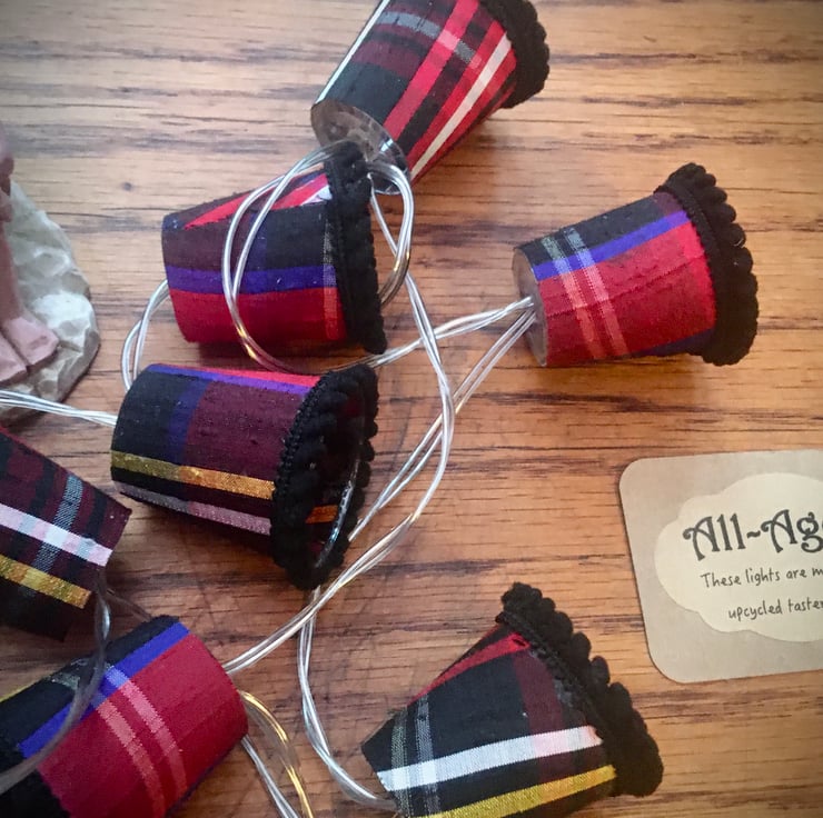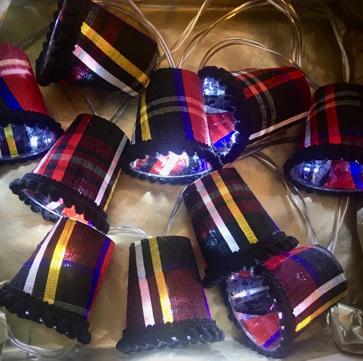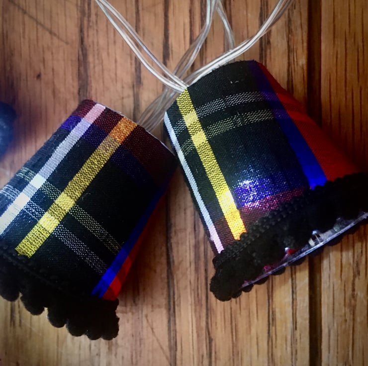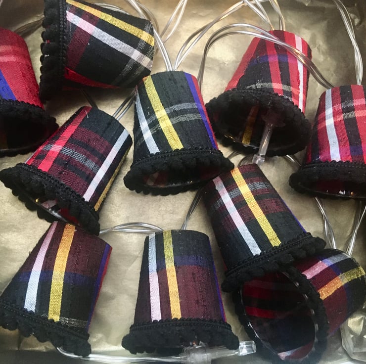 Who doesn't love a bit of tartan...this is a lovely silky and textured fabric in bright reds and deep blues, and run through with vibrant gold and white. Cute little pom pom trim finishes each elegant little highland lampshade!