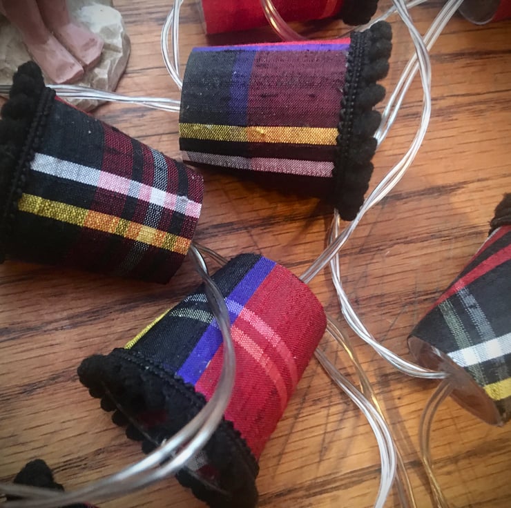 These mini lampshades are perfect to drape along a mantlepiece or shelf, around the head of a bed, or strung across a mirror or picture frame.