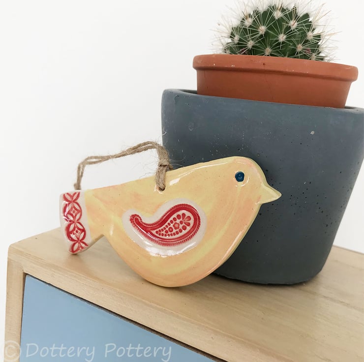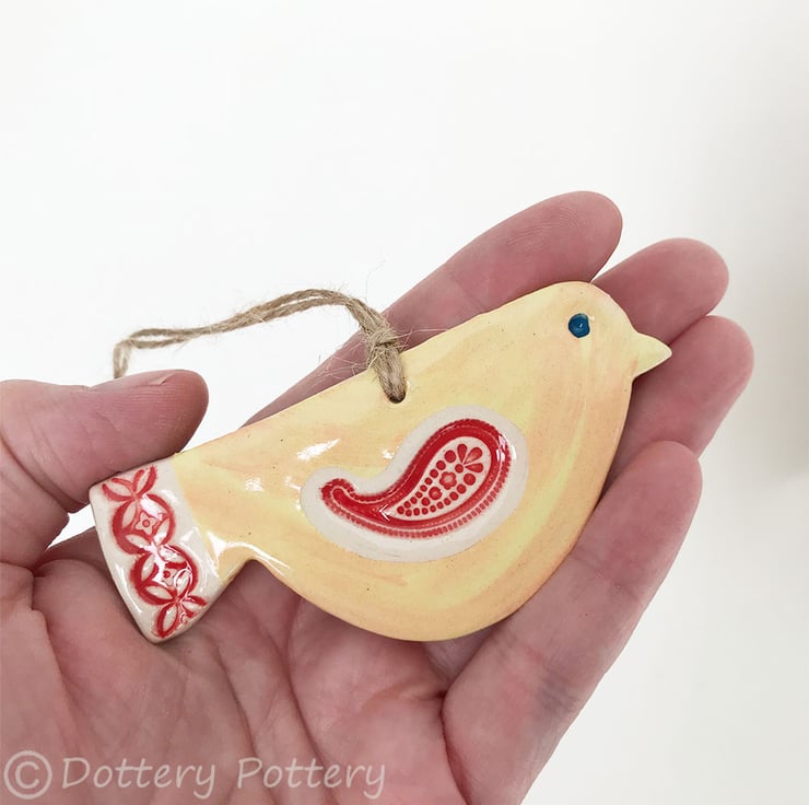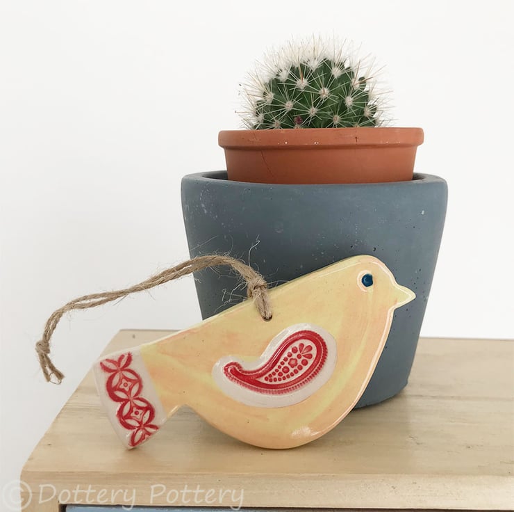This cute little pottery bird has been hand-cut from a template that I designed myself.