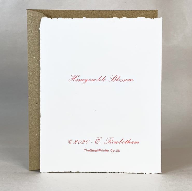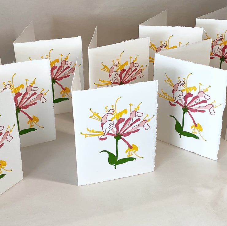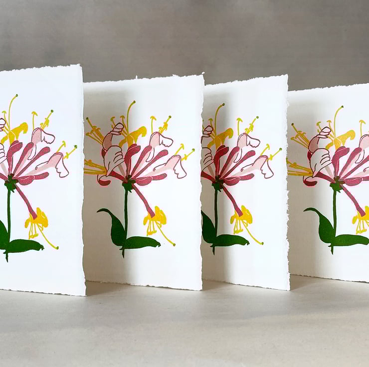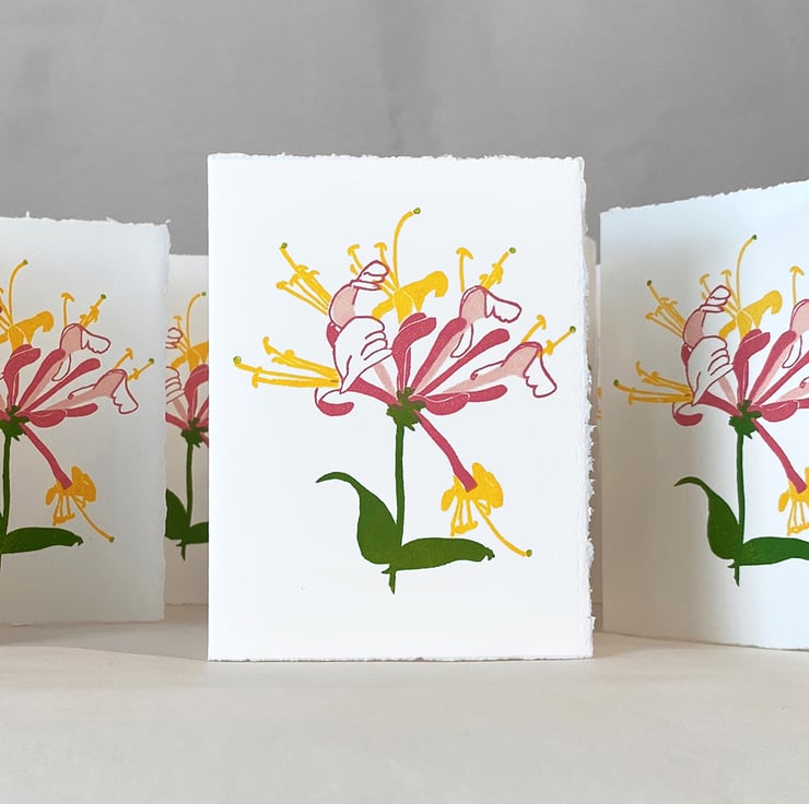 The colours are Honeysuckle blossom yellow, Honeysuckle bud deep-pink, honeysuckle petal pale-pink, foliage green - The photos disguise the soft matt quality of the paper & ink