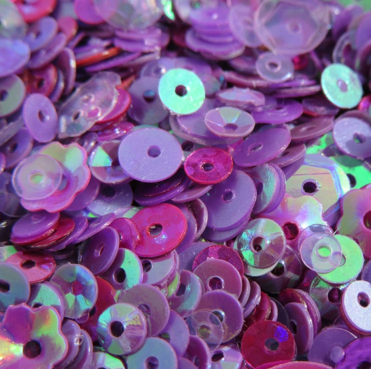 A mixture of holographic, clear, iridescent, pearlescent and opaque sequins in a variety of purples and pinks.
