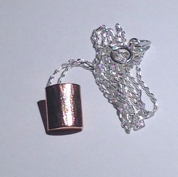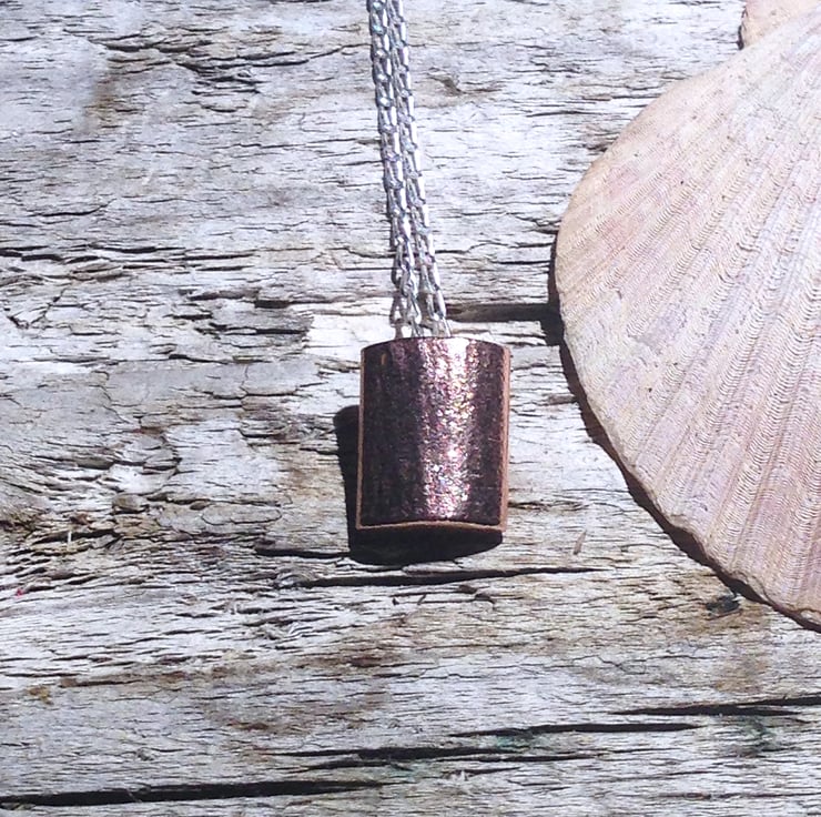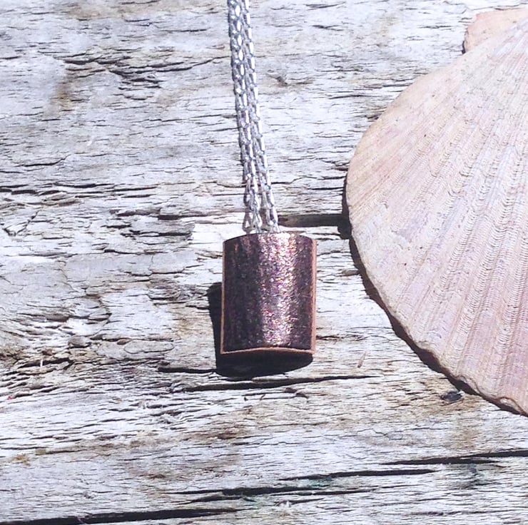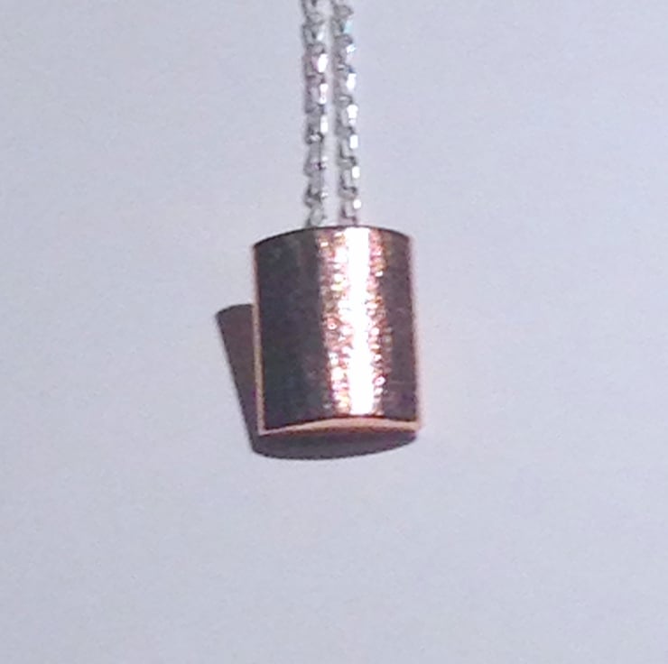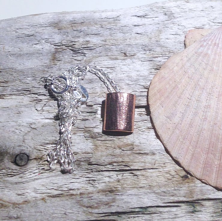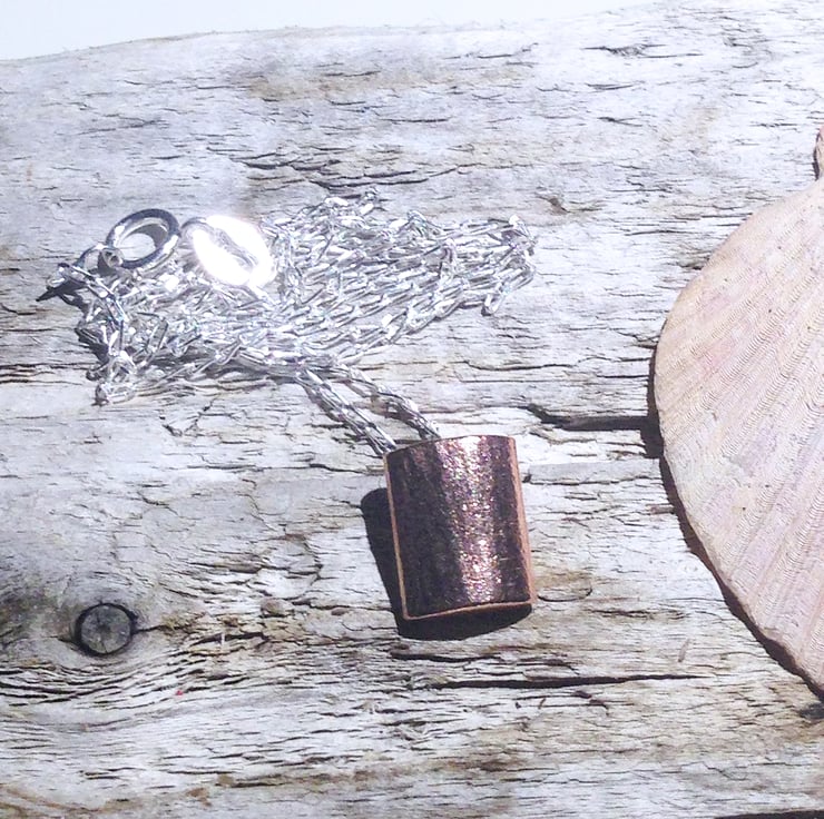 The pendant is cut from D shaped copper, measures approx 10.1 x 8 x 3 mm and is hung from an 18 inch sterling silver chain.