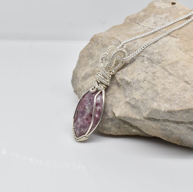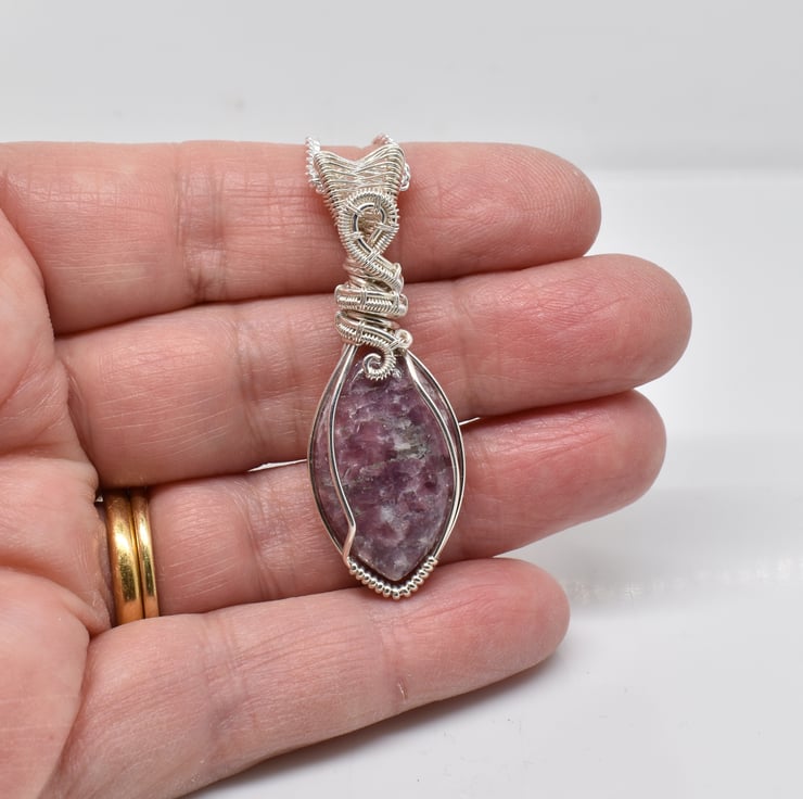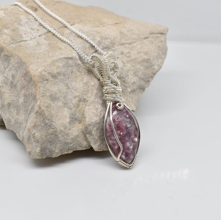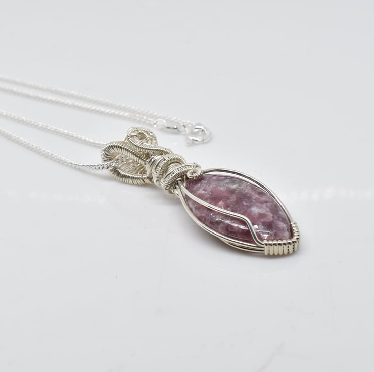 I have wire wrapped this lovely lepiolite pendant using sterling and fine silver wire. The thicker wires are sterling silver and the weaving wire is fine silver which is 99% pure.