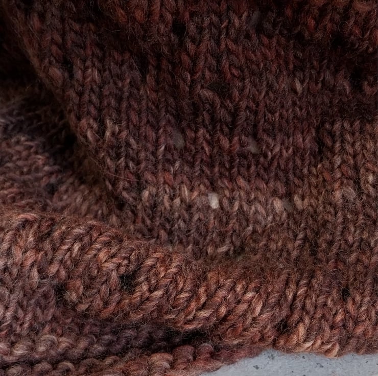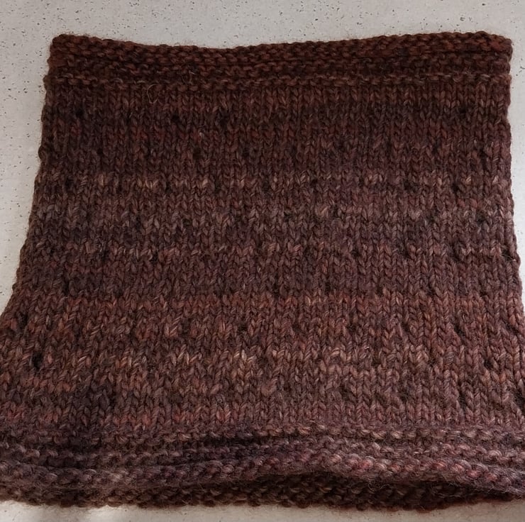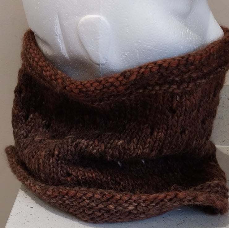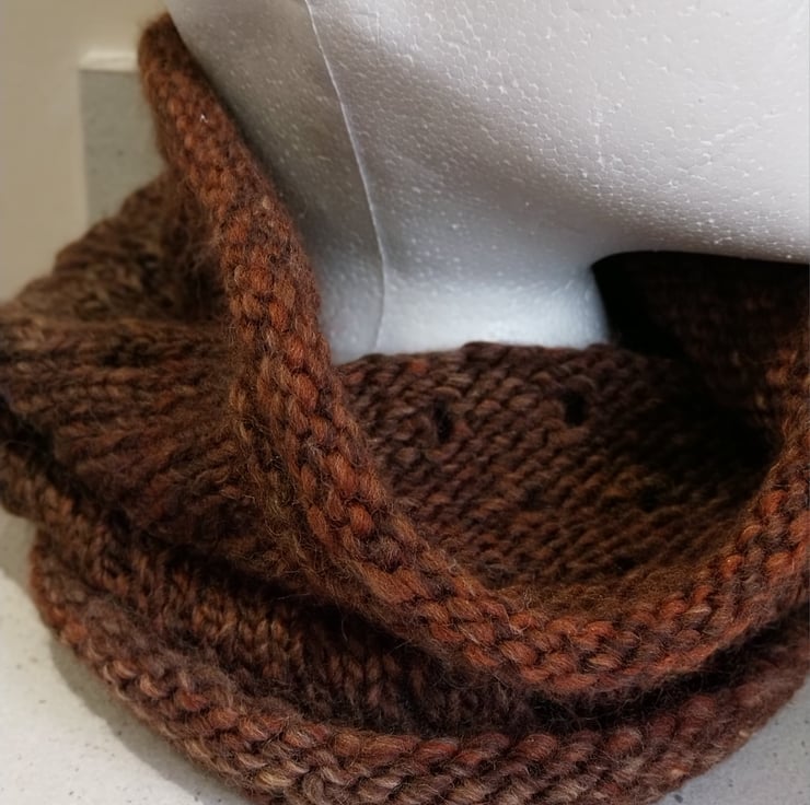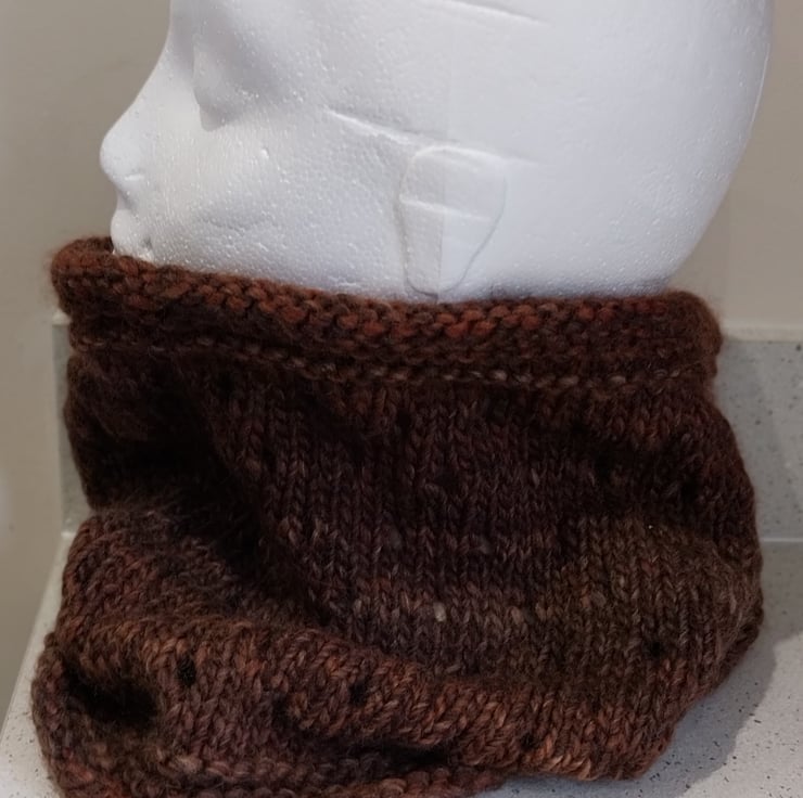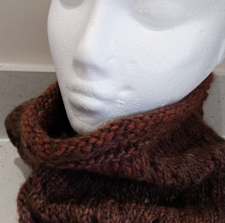 This cowl is a lovely subtle mix of variegated warm browns in a tweedy 70% Wool.
