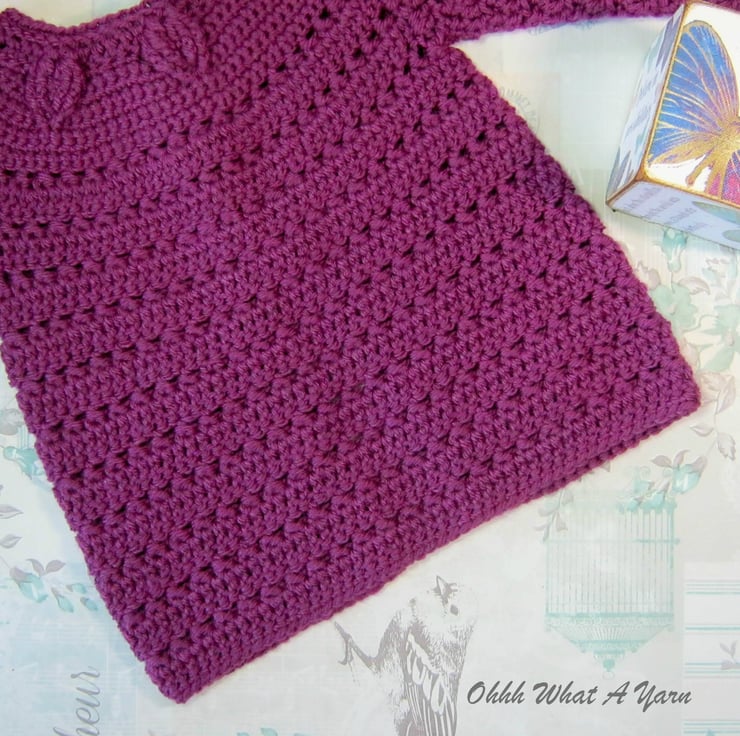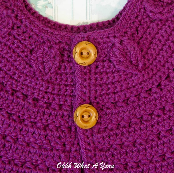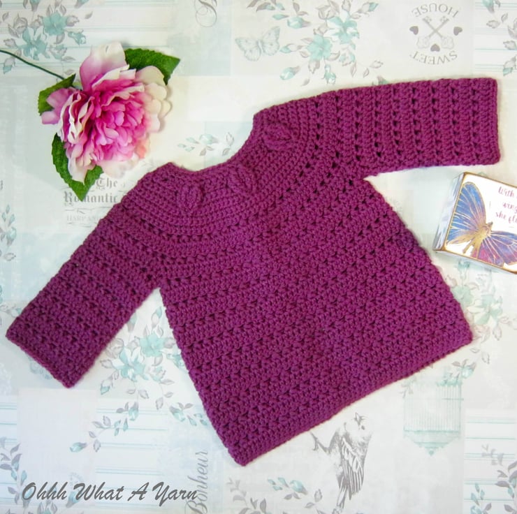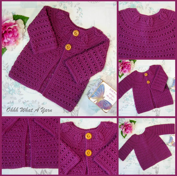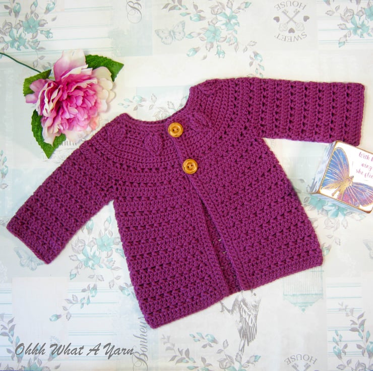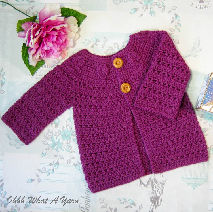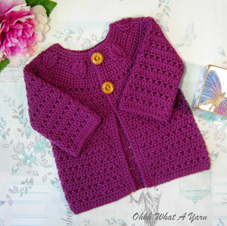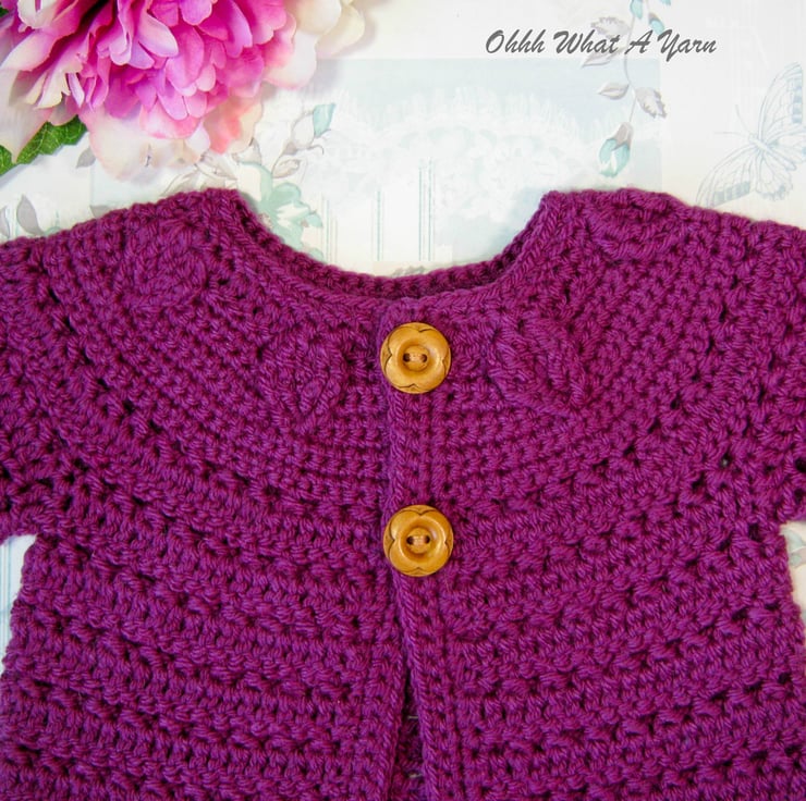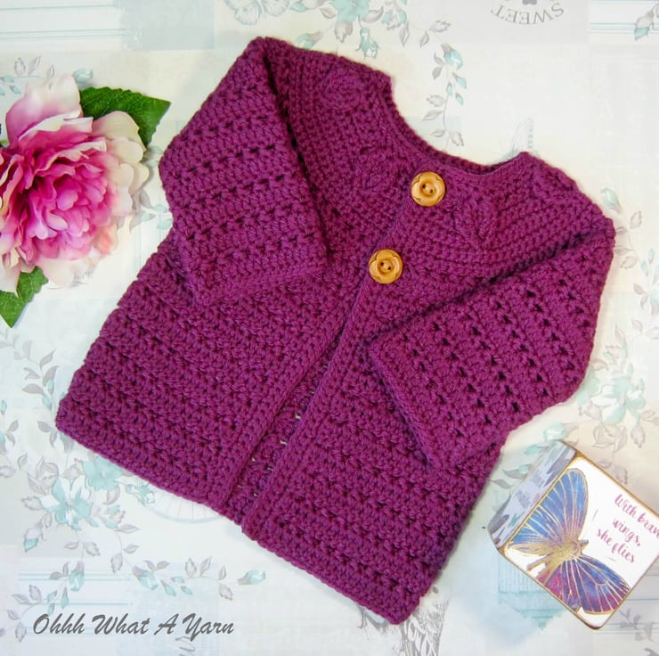 This pretty plum coloured baby cardigan has been crocheted using gorgeous Stylecraft Special 100% acrylic yarn.