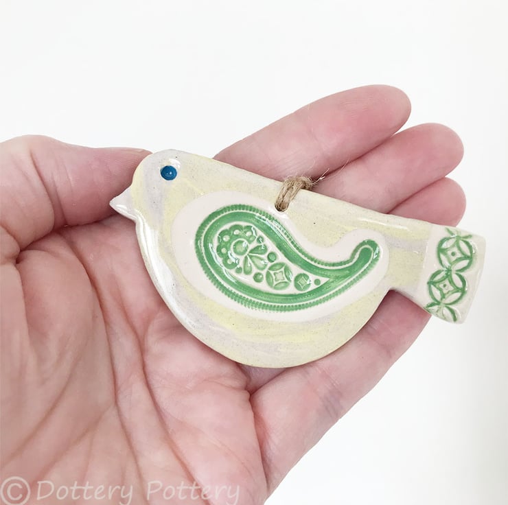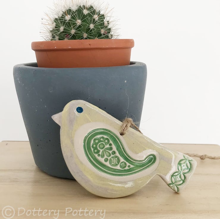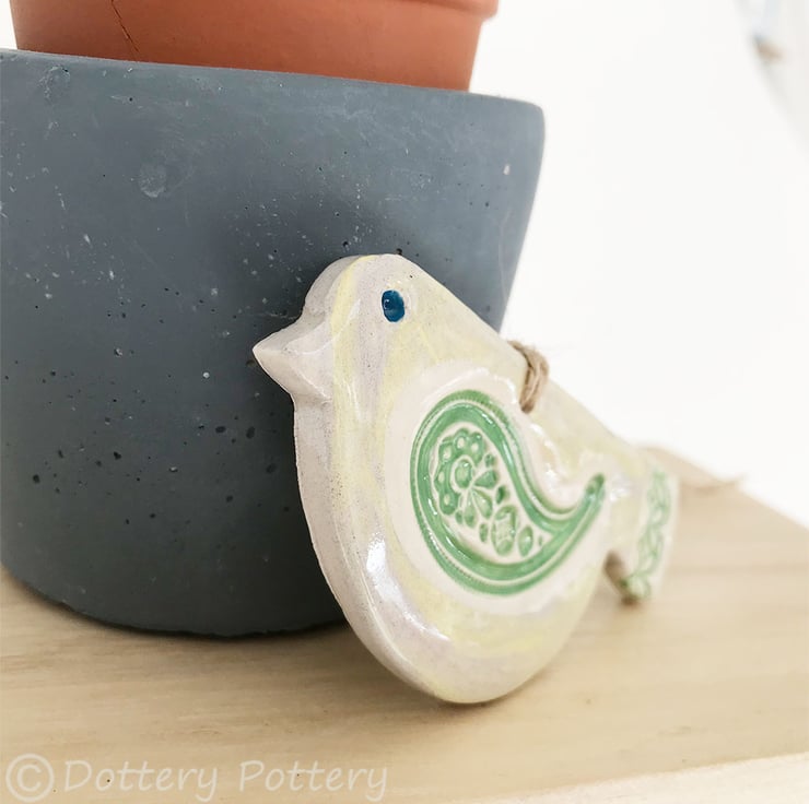 This cute little pottery bird has been hand-cut from a template that I designed myself.
