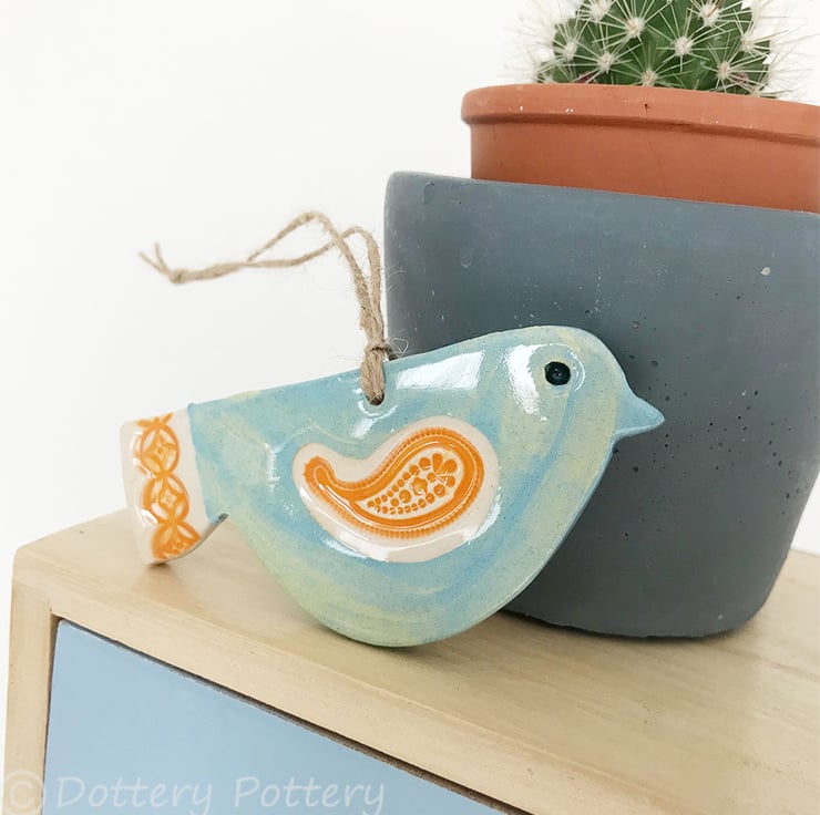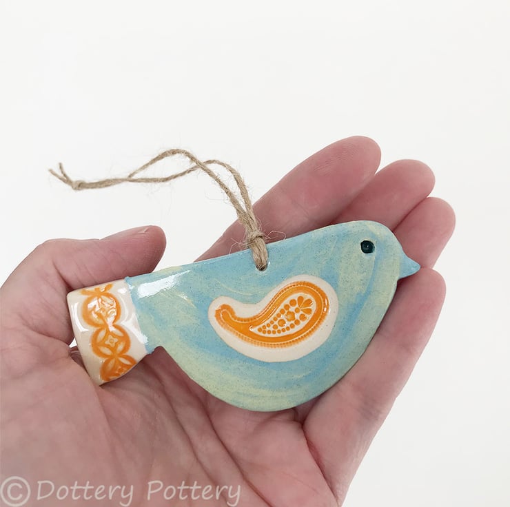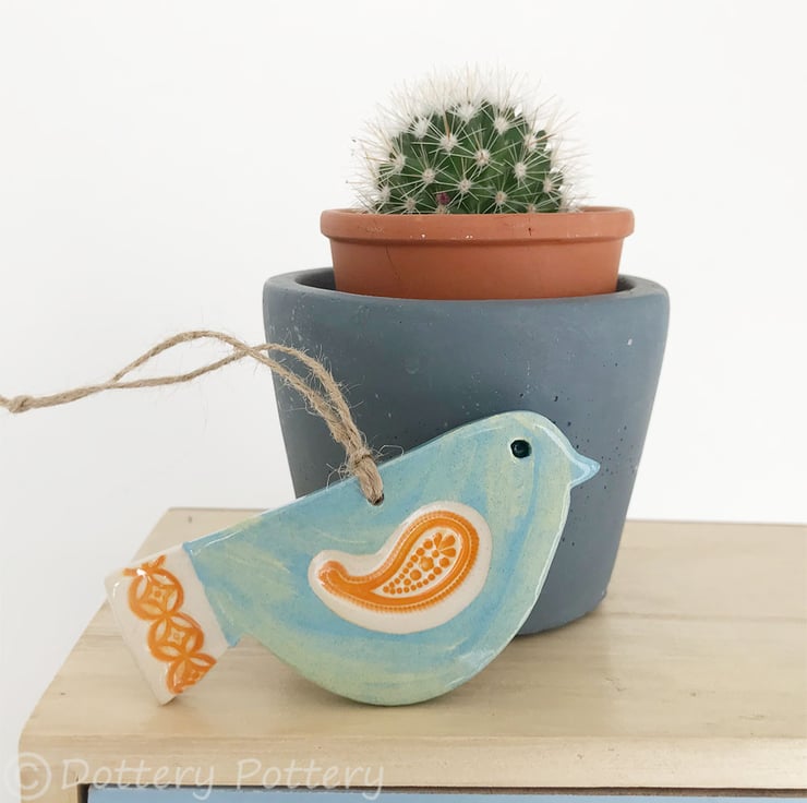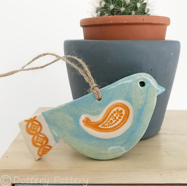 This cute little pottery bird has been hand-cut from a template that I designed myself.
