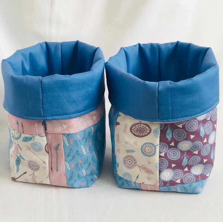 The boxes have been made by sewing scraps of quilting cotton together to make the outer fabric, lined with a plain cotton and thick batting used for stabilizing the structure. Each box can be left upright or the tops can be folded down to give contrast and to height desired.