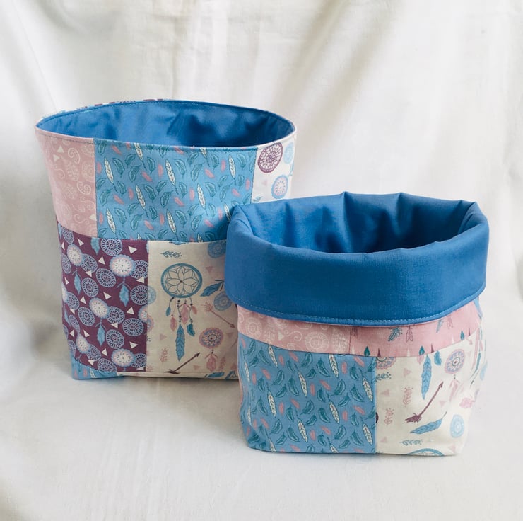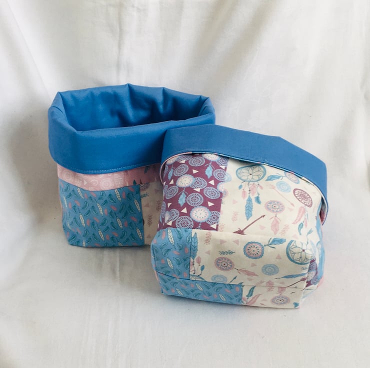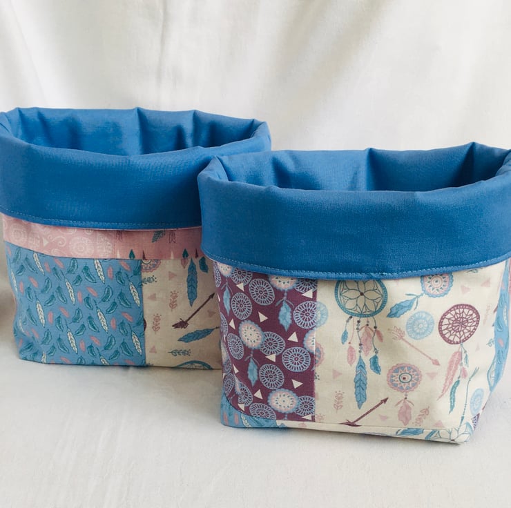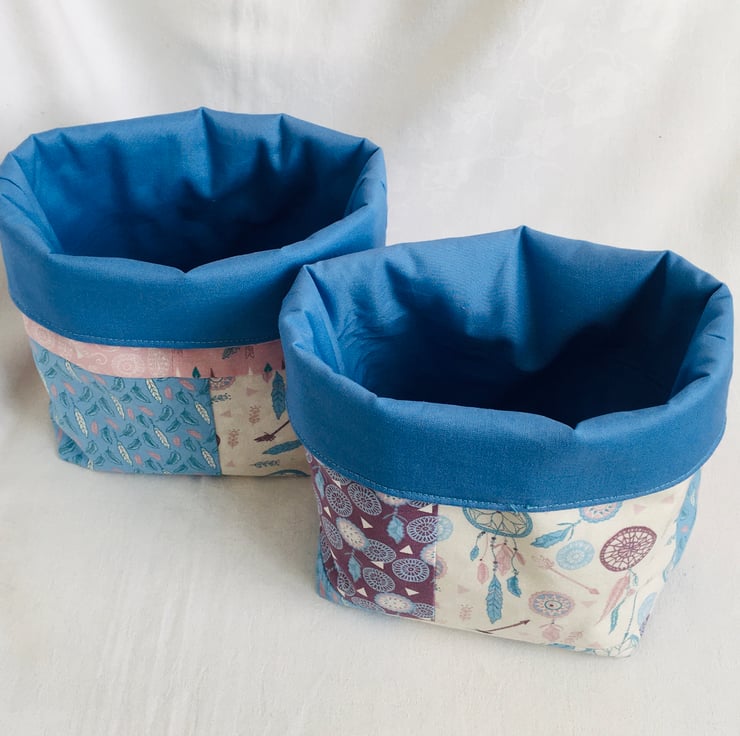 These are a pair of fun fabric boxes or tubs, that can be used for a multitude of things. These boxes are soft but still stand tall and proud. The uses for these are endless, great in any craft room. Great in a bedroom on a dressing table, or simply by the phone to throw your keys in. Even displayed on a coffee table with potpourri or sweets in.