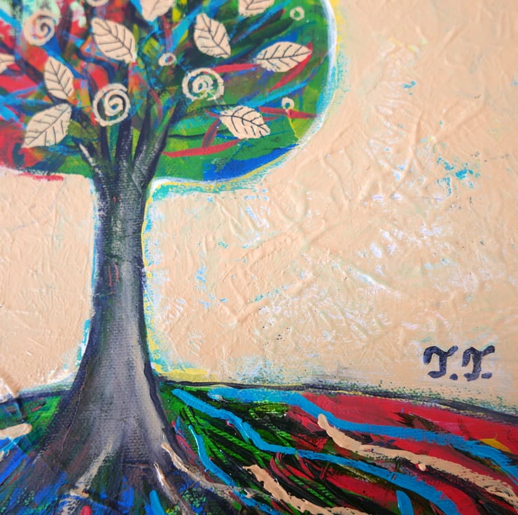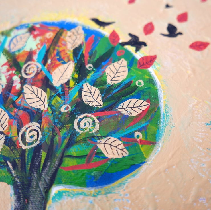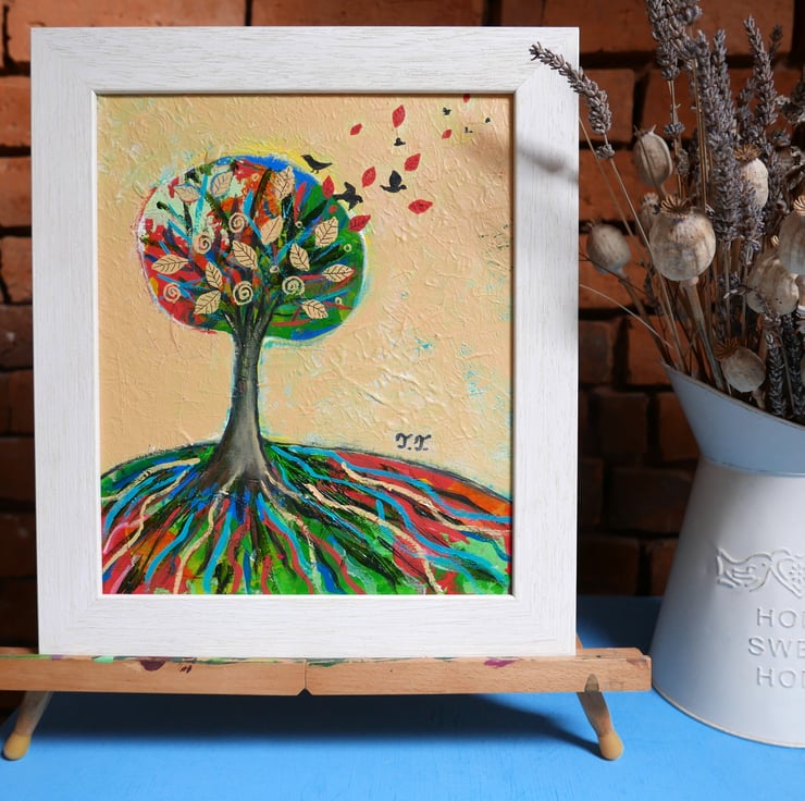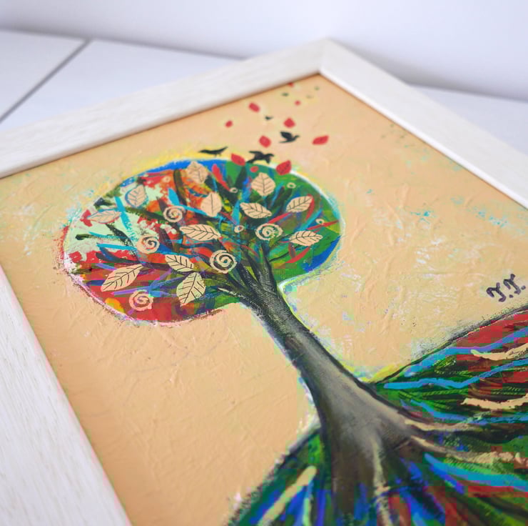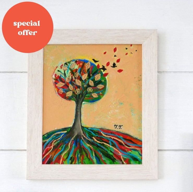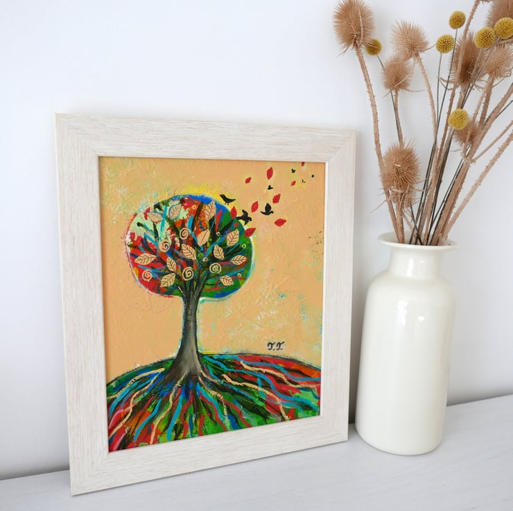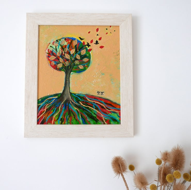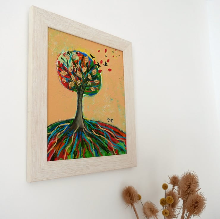 This original autumn painting is created in acrylic on canvas board and it is framed and ready to hang. The artwork features an autumnal landscape with a solitary tree on a hill against a warm yellow background. the frame is a light shade of beige perfectly complementing the artwork. The title of the painting is "Solitary Tree III" and it comes with a certificate of authenticity. The painting is very textured and this can be seen in the detailed photos and it gives the artwork a contemporary look.