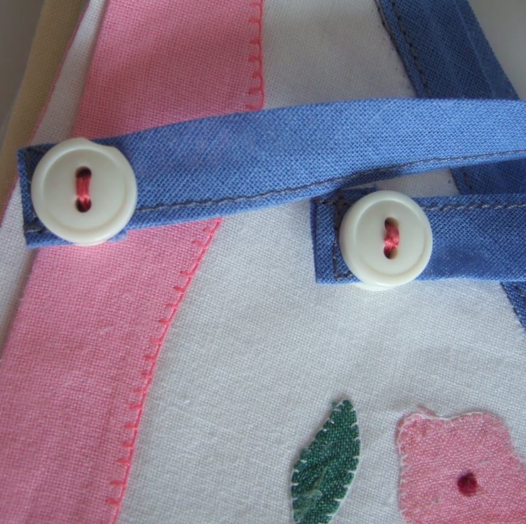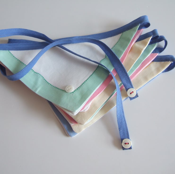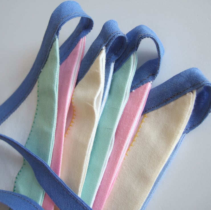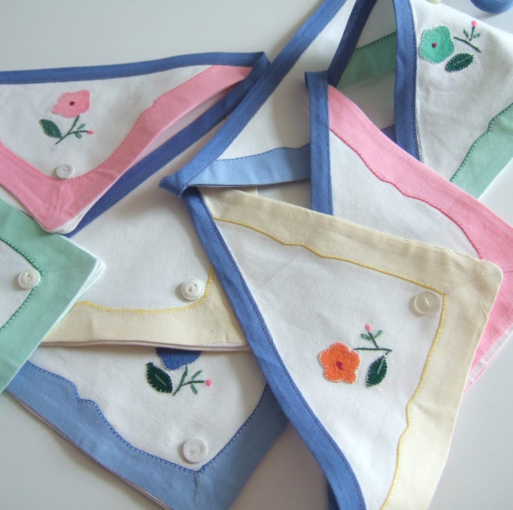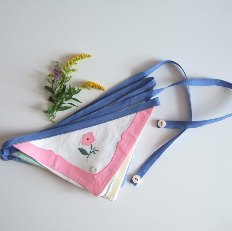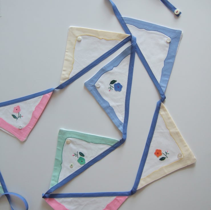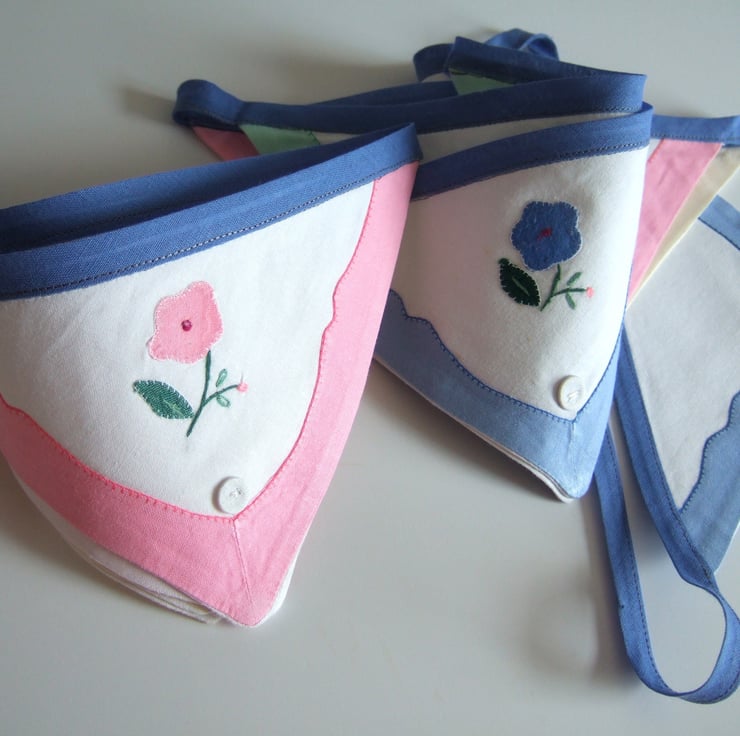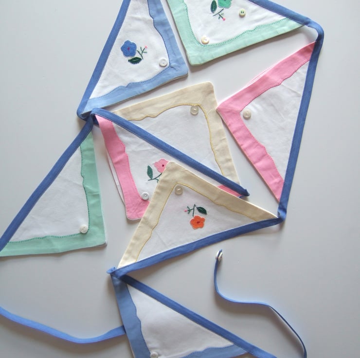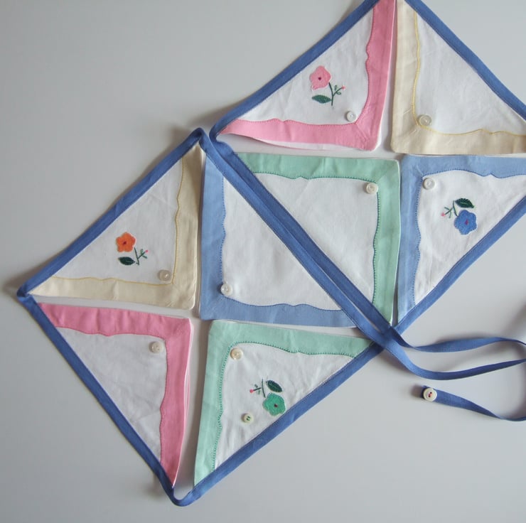 This sweet and pretty vintage bunting is made from old table napkins. Each flag is edged front and back with a pastel border, and a tiny old button at each point gives a nice finish and a little weight to the fabric. Four of the flags have an appliqued flower on one side. Perfect for a vintage wedding, a summer party or as an eco decoration, this little strip of bunting would pretty up the corner of a wedding barn or a student flat.