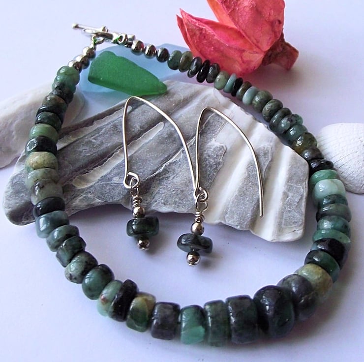 Natural Emerald earring and bracelet set. Bracelet is made with coated beading wire and silver plate toggle clasp. Earrings have Sterling silver handmade ear wires and wrapped finish bead post.